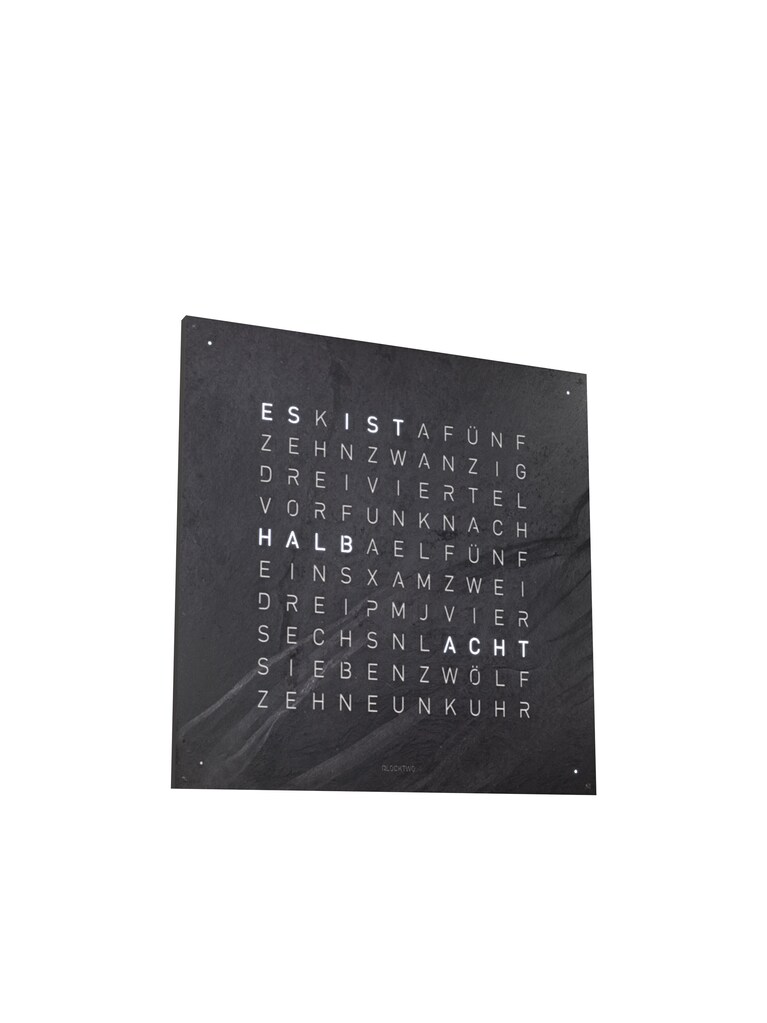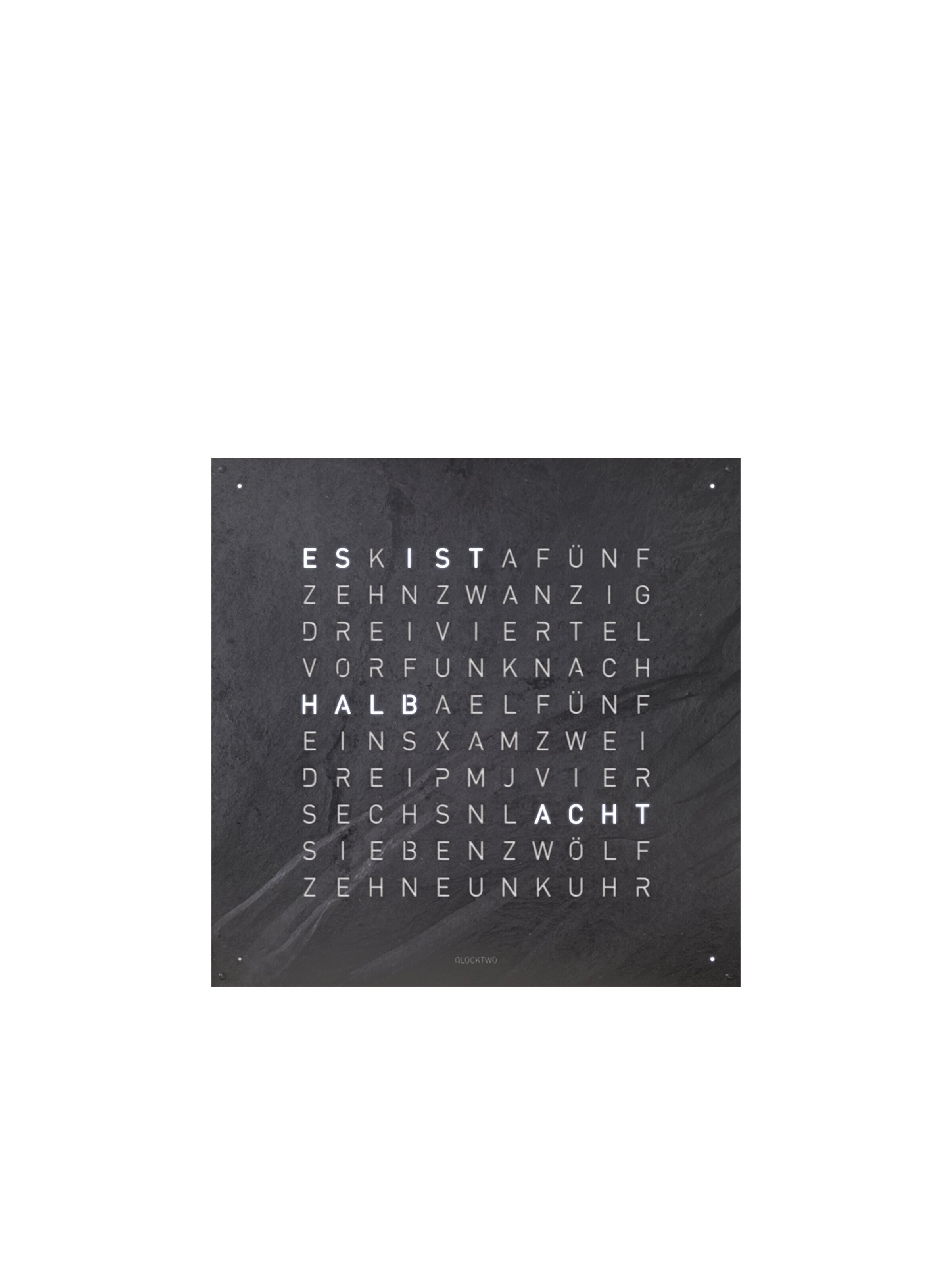 The Qlocktwo wall clock Ref. LG4ENMM-US transforms time into a calm, typographic experience that fills any room with a special atmosphere. Instead of traditional hands, it displays the hours and minutes as clearly legible words that look like a luminous installation and constantly captivate the eye. The slate front gives the clock its distinctive character: each surface has an individual structure reminiscent of natural rock formations, creating a one-of-a-kind piece on the wall. The subtle slate color scheme harmonizes just as well with minimalist interiors as it does with warm living spaces. Inside, an electric movement ensures reliable time display that makes its presence felt in everyday life in a discreet yet striking way. The result is a design object that elegantly combines technology and art and invites you to turn time awareness into a daily ritual.