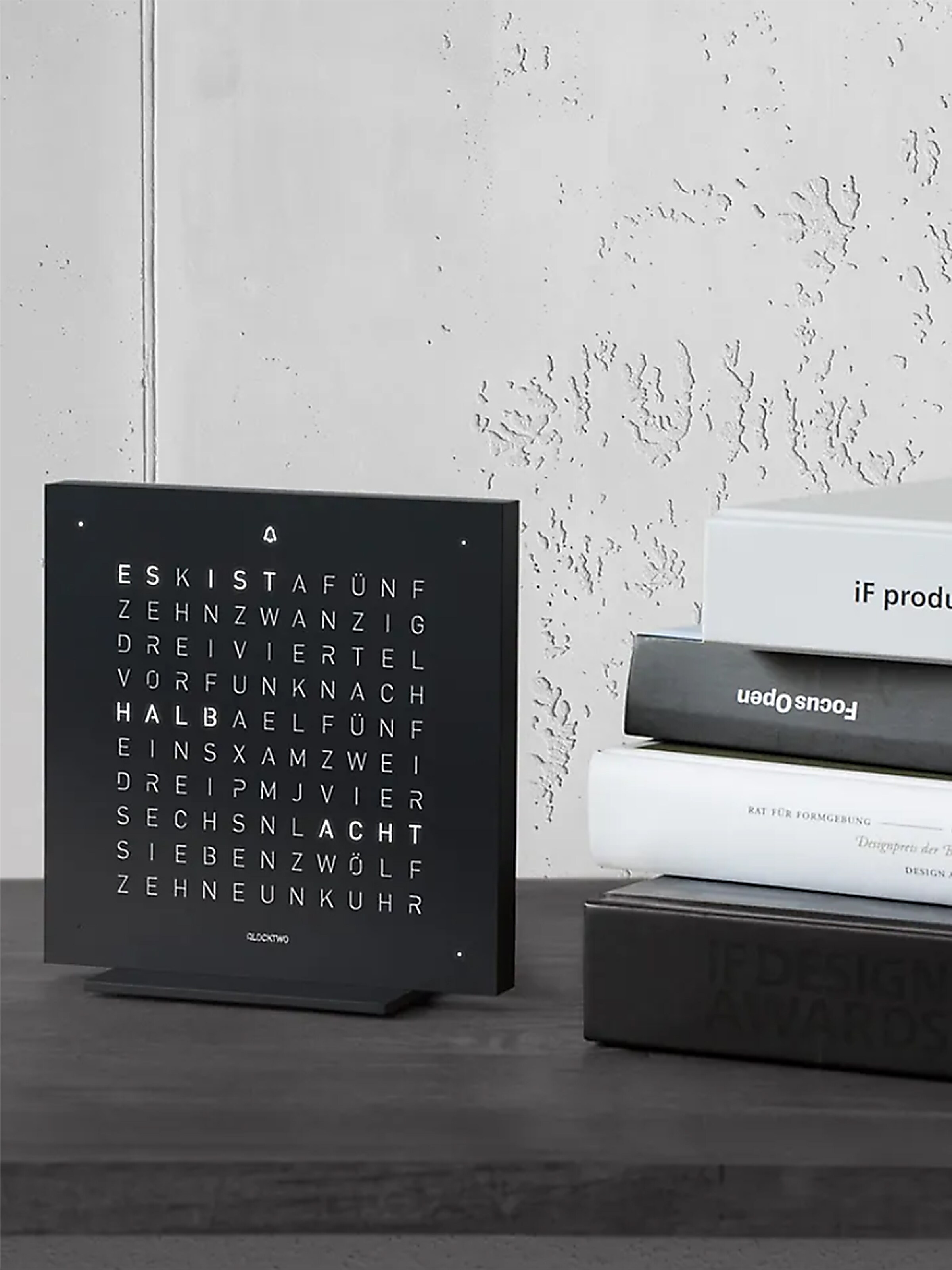 The Deep Black Touch (Ref. T4BLENSSBL) is a compact table clock with an alarm, snooze, and night light function. It features a simple touch operation in the unique Qlocktwo design created by artists Marco Biegert and Andreas Funk. As with the large-size models, the centerpiece of this timepiece—measuring 135 x 135 millimeters and only 17 millimeters in depth—is a matrix of 110 letters arranged in a seemingly random pattern. These letters display the time using an LED panel light positioned behind them. Four additional illuminated points in the corners represent the minutes and complete the time display. This model variant captivates with its sleek matte black anodized aluminum body and a front cover with a deep black coating. The integrated light sensor automatically adjusts the LED lights to the ambient light conditions. In Night-Touch mode, the clock is completely dark, and it only displays the time briefly when you touch its surface.