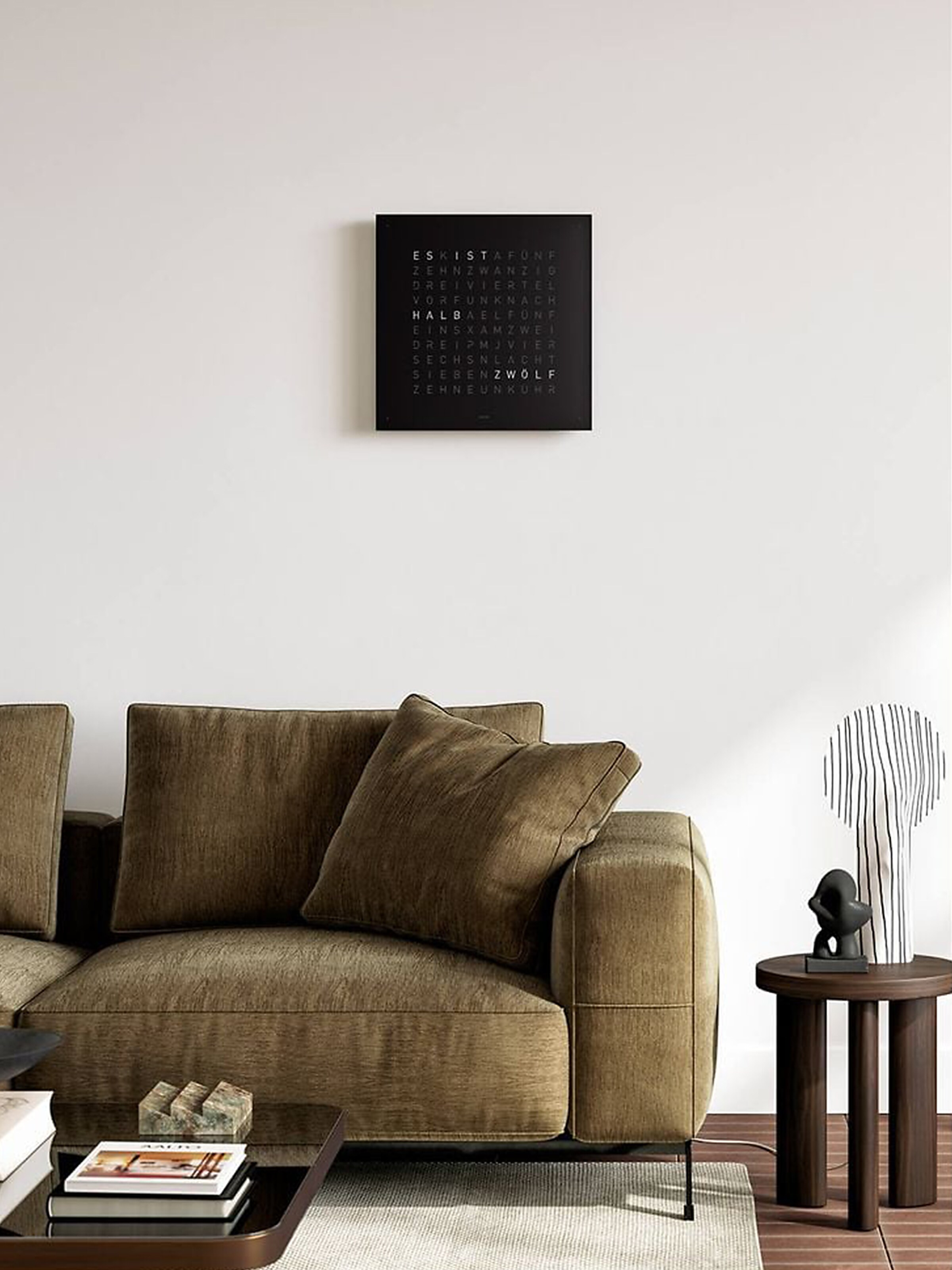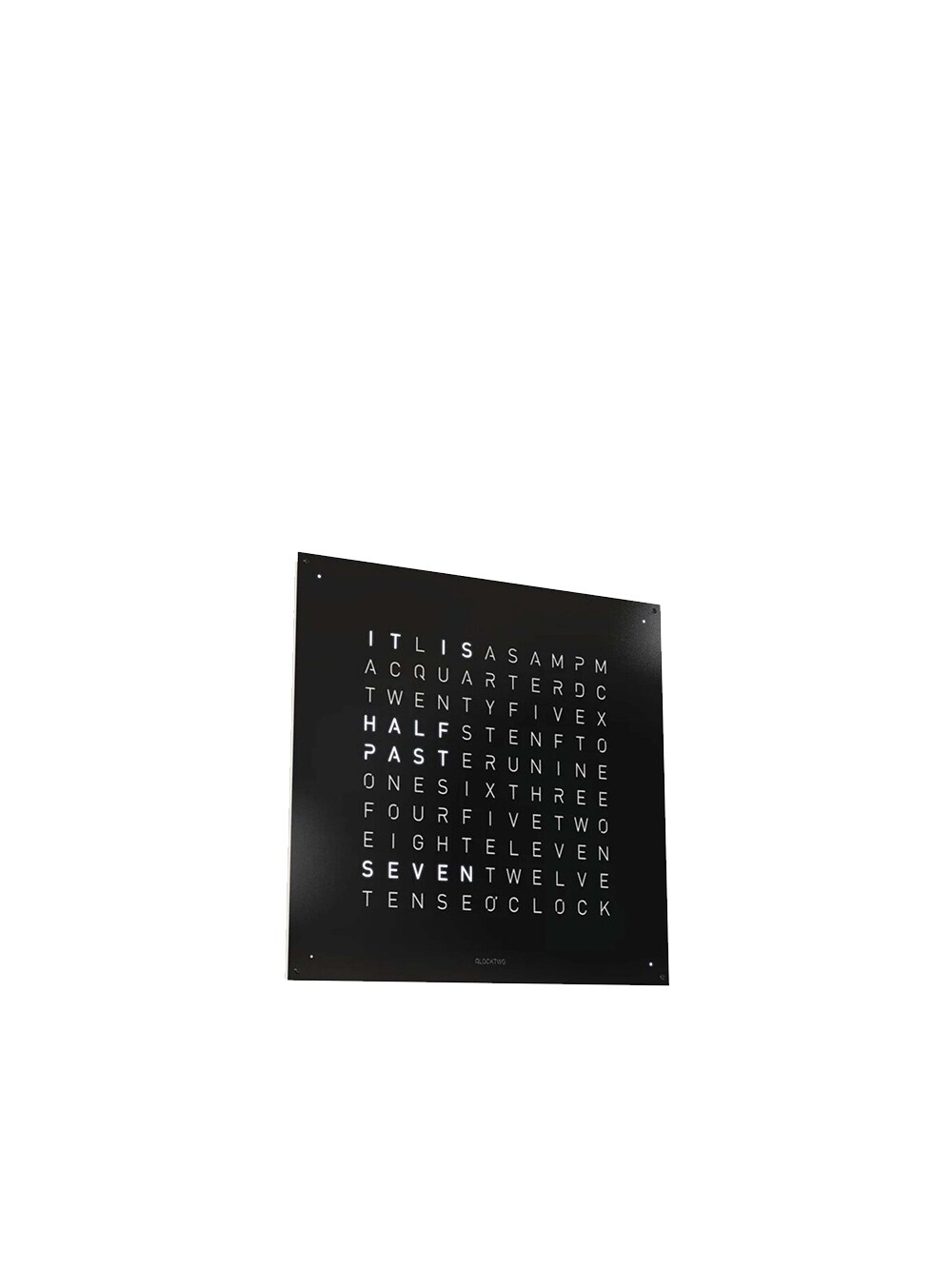 The square-shaped Qlocktwo Earth 45 Steel Series Black Pepper (Ref. QT4BLENBLPC) is the ultimate expression of contemporary time design. Telling the time has never been more refined. Its centrepiece is a matrix featuring 110 letters arranged randomly to display the time using an LED panel light positioned behind it. The four additional illuminated points in the corners represent the minutes and complete the time display. This model variant measures 45 x 45 centimeters at a depth of 22 millimeters. Its steel surface is finished in a deep black tone that exudes understated elegance and precision. The result is a timepiece that merges technological sophistication with timeless aesthetics, transforming the simple act of reading the time into an experience of pure design clarity.