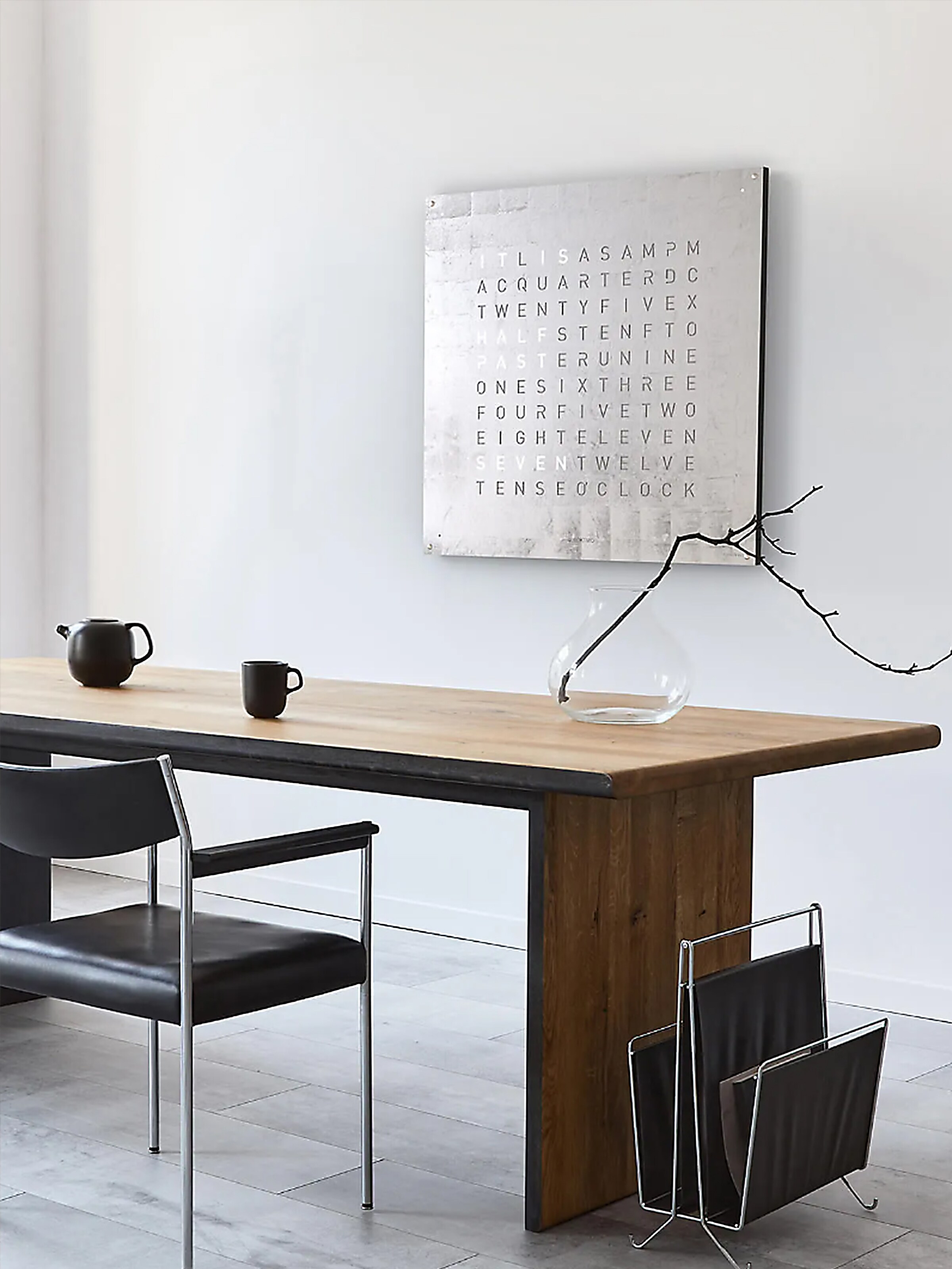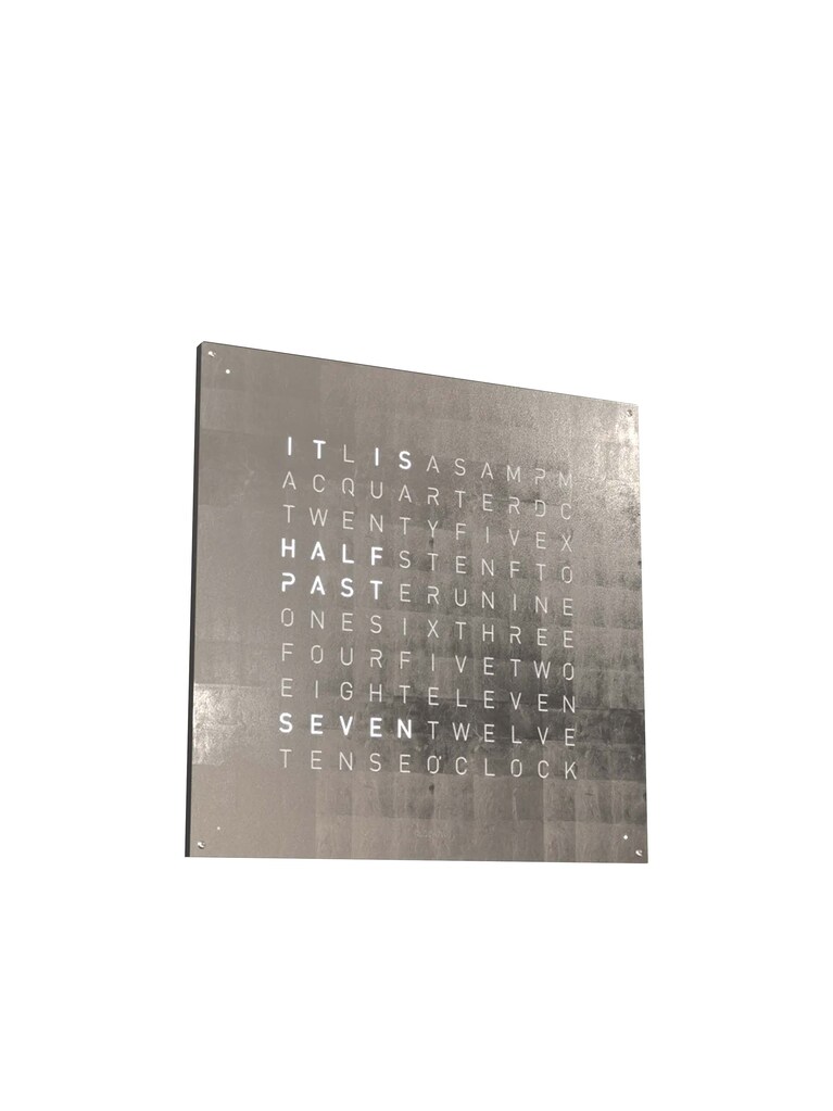 The square-shaped Qlocktwo Platinum Large (Ref. LG4BLENPL) from the two artists Marco Biegert and Andreas Funk is the ultimate timepiece. This multi-award winning wall clock's centerpiece is a matrix featuring 110 letters arranged randomly to display the time using an LED panel light positioned behind it. Four additional illuminated points in the corners represent the minutes and complete the time display. This model variant measures 90 x 90 centimeters at a depth of only 32 millimeters. The Qlocktwo Platinum Large is a stunning piece of art. Its surface is made of platinum plates that shimmer in a unique way, making each model one of a kind. Thanks to its integrated light sensor, it fills rooms with high-quality, exceptional, and progressive design in any ambient light.