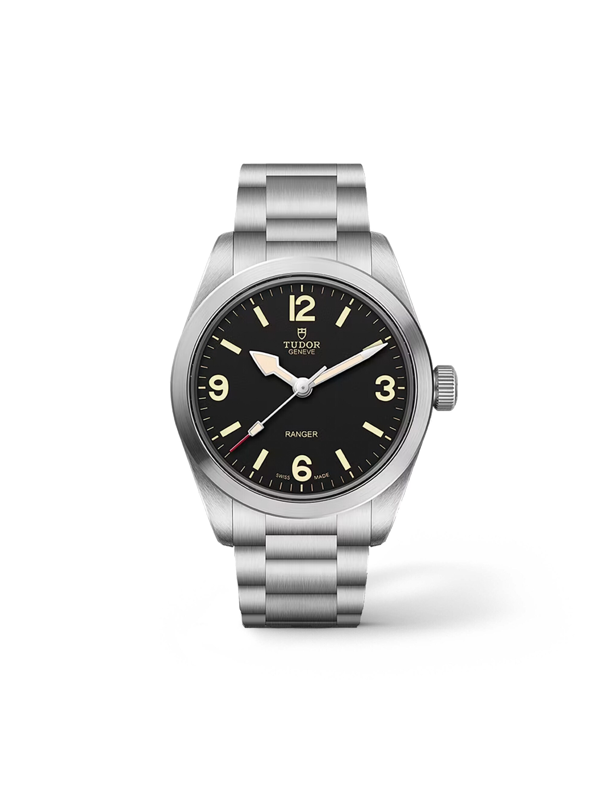 The Tudor Ranger 36 mm, reference TU280268, continues the spirit of early exploration watches and stands as a reliable companion for every adventure. Its 36-millimeter stainless-steel case, black dial with bold Arabic numerals, and distinctive central seconds hand reflect the aesthetic heritage of historic Ranger models, while the automatic Manufacture Calibre MT5400 inside delivers modern precision. With sapphire crystal, an impressive 70-hour power reserve, and a sleek stainless-steel bracelet, this watch blends robust functionality with timeless elegance. Its water resistance up to 1 bar underscores its authentic expedition character and ensures the Ranger tradition remains firmly rooted within the TUDOR collection.