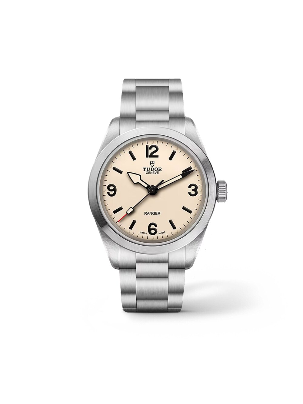The Tudor Ranger 39 mm with reference TU280264 continues the spirit of historic expedition timepieces, combining robust functionality with the clean aesthetic of a true adventurer. Its 39 mm stainless steel case frames a beige dial with distinctive Arabic numerals and a central seconds hand, while the automatic Manufacture Calibre MT5402 delivers an impressive 70-hour power reserve. The silver stainless-steel bracelet and water resistance up to 1 bar emphasize the practical character of this model, uniting tradition and modern engineering to carry the legacy of the Ranger line into the present.