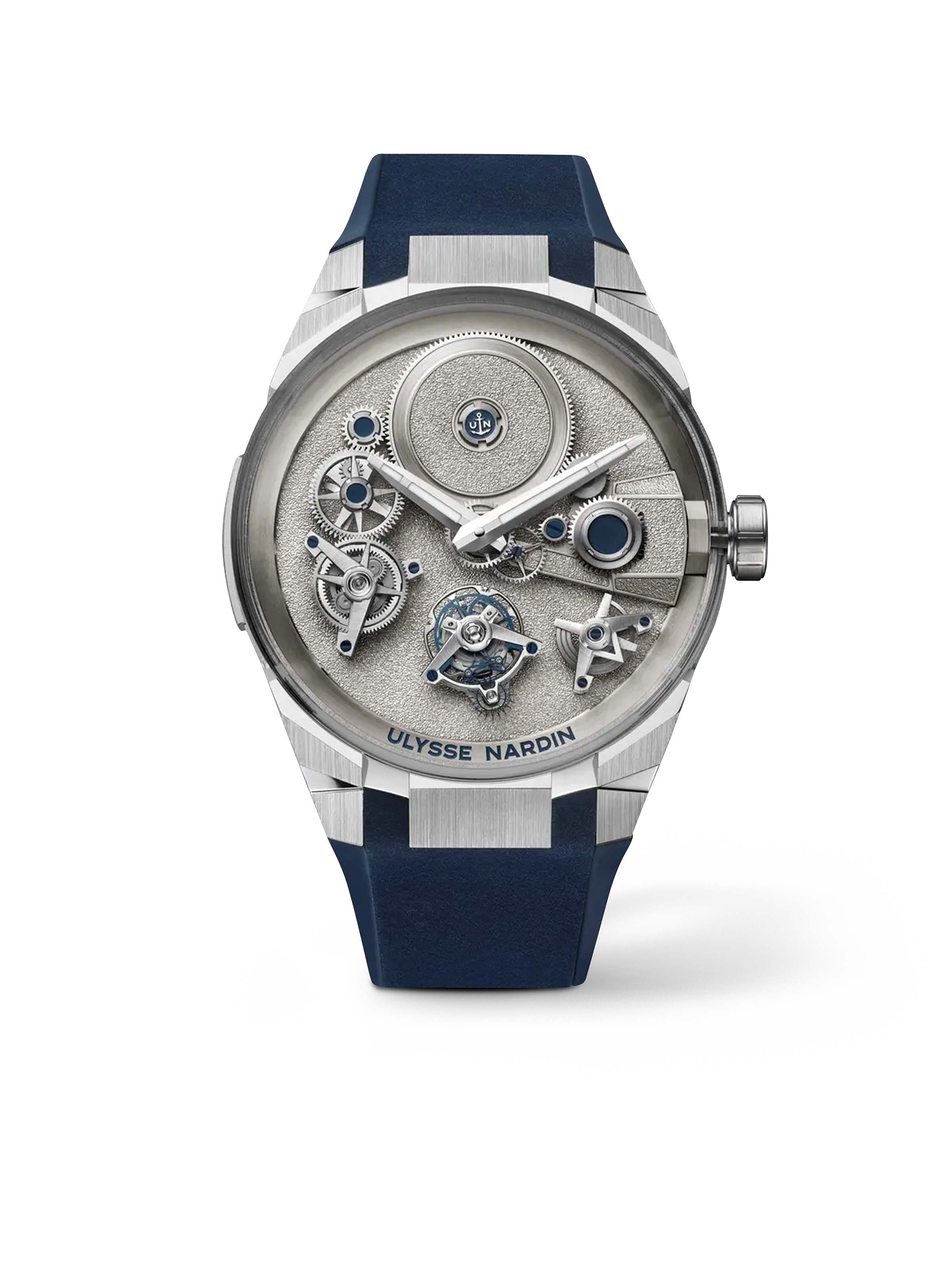 Blast Free Wheel Maillechort 45 mm, 18k white gold with blue rubber strap, manual winding mechanism manufacture calibre UN-176 with tourbillon and power reserve indicator, limited to 50 pieces | Reference Number UN150093