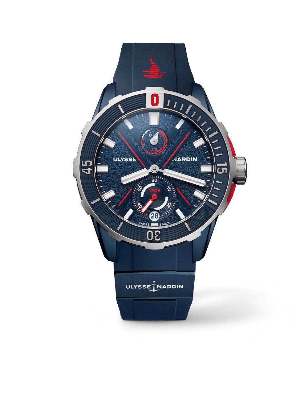 The Ulysse Nardin Ref. 1183-170LE-3A-HAMMER/3A embodies maritime inspiration and modern sportiness in a striking format. The 44mm titanium case ensures a bold presence while providing a comfortable fit on the wrist. The blue dial, with clear indices and a small seconds display, combines legibility with dynamic character. This impression is reinforced by the matching blue rubber strap, which emphasizes the sporty appeal while offering exceptional comfort. Inside, the UN-118 automatic movement delivers a power reserve of up to 60 hours, ensuring reliable precision across a wide range of activities. Water resistance up to 30 bar offers ample freedom for use in and around water. Scratch-resistant sapphire crystal protects the dial, while the transparent case back allows a view of the meticulously finished movement. The result is a distinctive timepiece that harmoniously combines functionality with luxurious elegance.