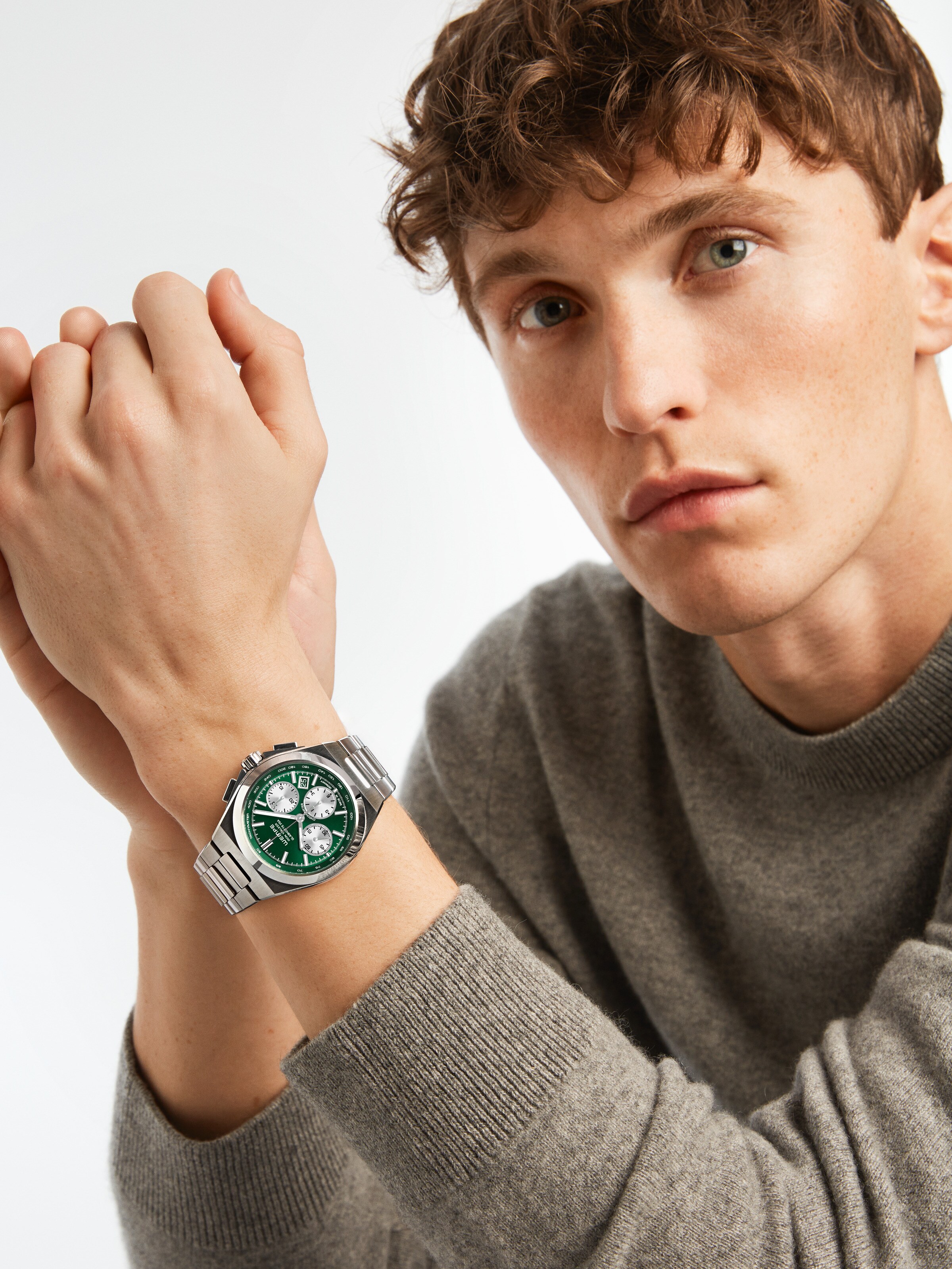 The Iron Walker Chronograph 42 from Wempe Glashütte i/SA, reference WI300003, embodies strength and precision within a modern design. With a 42-millimeter diameter and a case and bracelet crafted from stainless steel, this men's watch exudes a confident elegance. The green dial makes a striking statement and offers exceptional legibility. Its functionality is powered by the ETA 7753 Valjoux automatic movement, which provides not only timekeeping but also a chronograph function and a tachymeter. The watch is water-resistant up to 10 bar and boasts a 48-hour power reserve. A sapphire crystal protects the dial, while the stainless steel bezel and case back underscore its robust construction. The watch is fitted with a folding clasp, ensuring a secure and comfortable fit on the wrist. This exclusive model, new to our collection, highlights the technical expertise and design mastery of Wempe Glashütte i/SA.