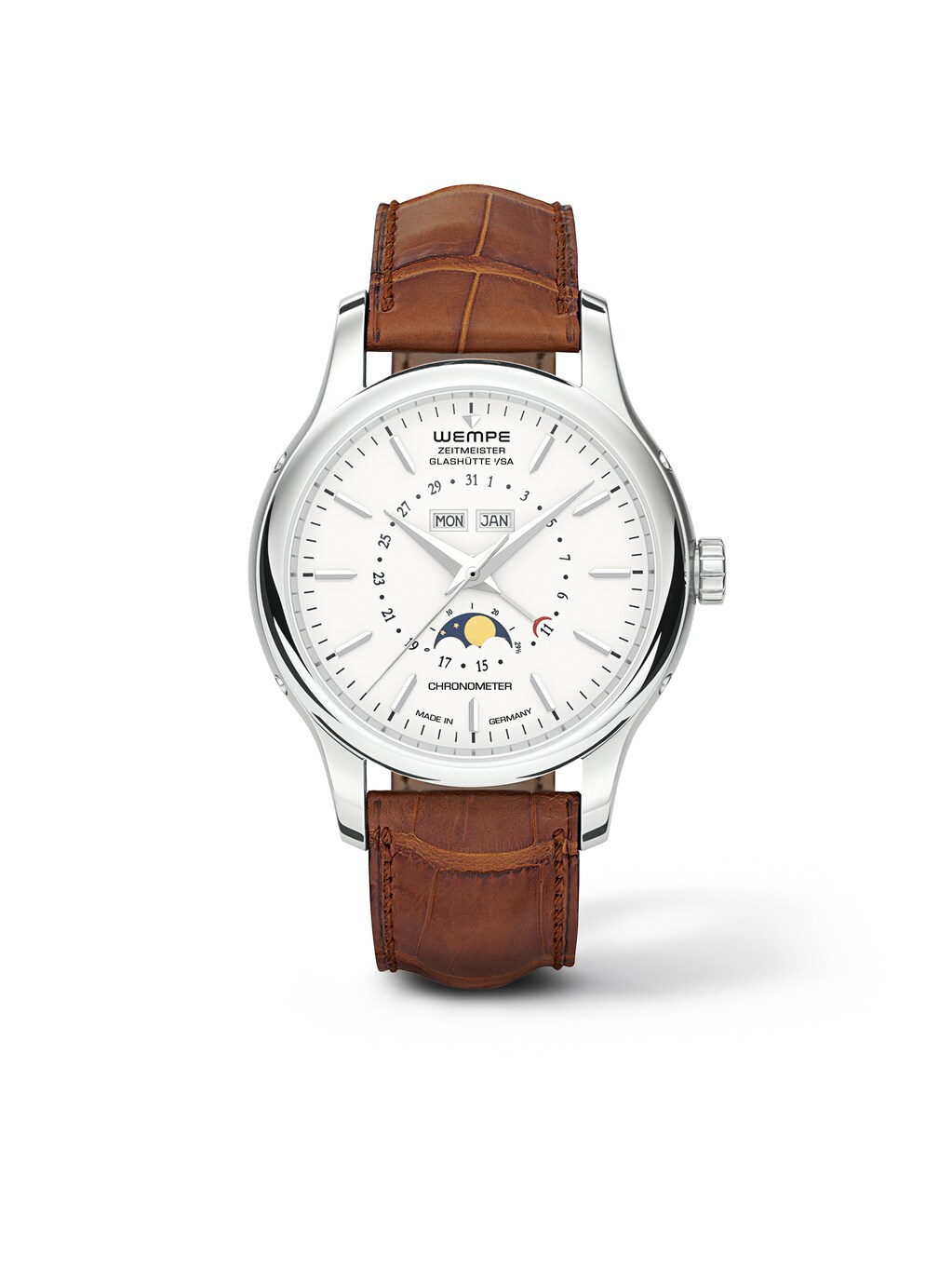 Zeitmeister Classic Full Calendar Moon Phase 42 mm, stainless steel with brown alligator-skin strap, self-winding caliber ETA 2892-A2 with module DD 5900 with moon phase and full calendar | Reference Number WM350063