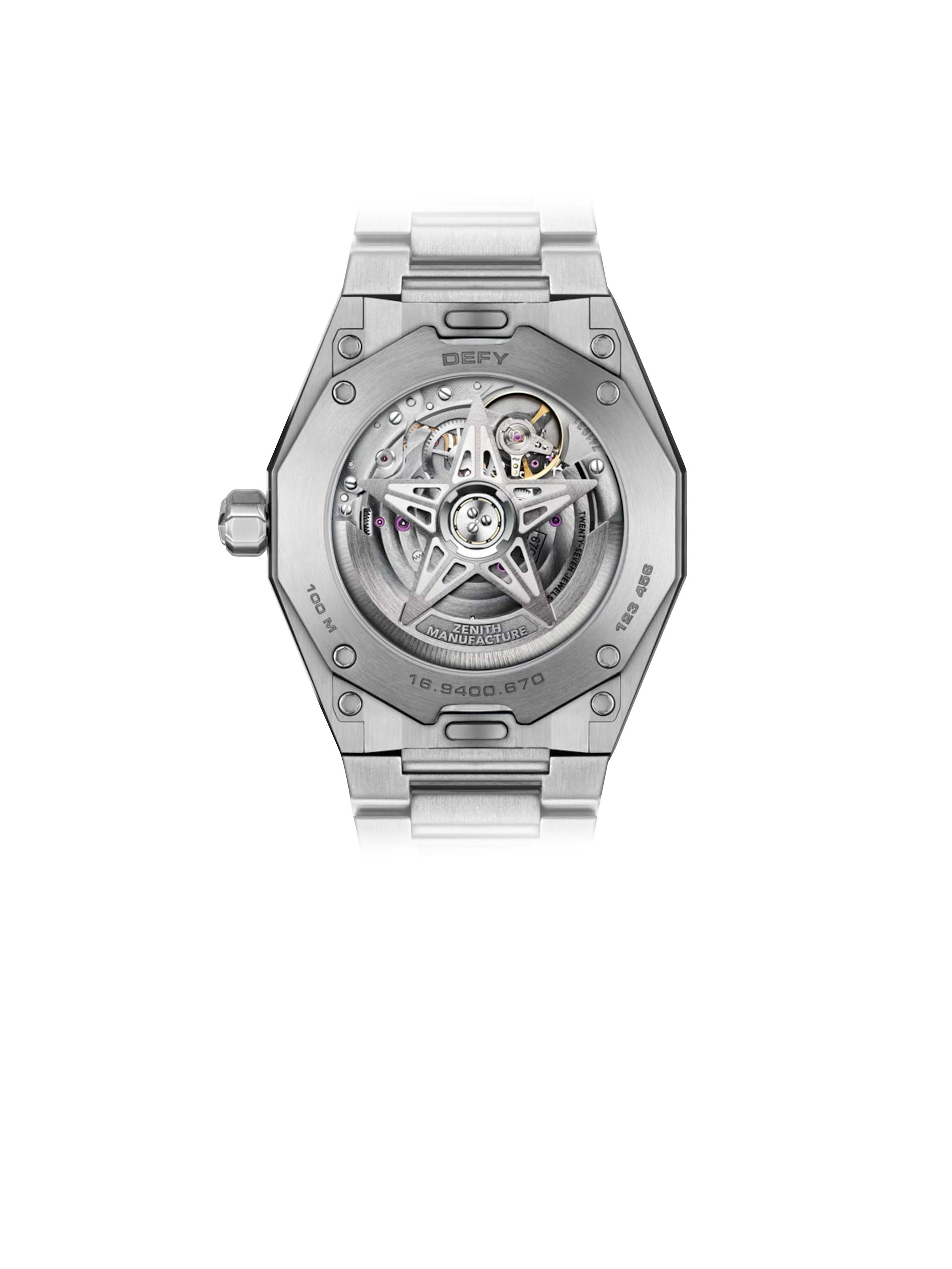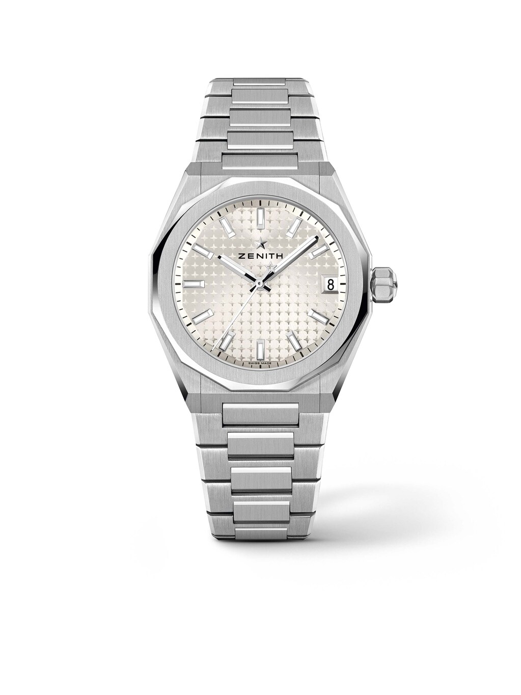 With its 36-millimeter stainless steel case, the feminine Defy Skyline 36 (Ref. 16.9400.670/01.I001) embodies contemporary elegance and confident sophistication, expressing the unmistakable design language of ZENITH in a refined ladies’ timepiece. The silver dial reveals a subtle depth through its signature star-pattern motif, a modern tribute to the collection’s historic roots, while maintaining a crisp, luminous aesthetic. Housed within the case is the self-winding manufacture caliber Elite 670, an automatic movement with a power reserve of up to 50 hours and a discreet date display at three o’clock. Water-resistant to 10 BAR (100 meters), this watch is designed for everyday versatility, combining technical performance with timeless style. Completed with a stainless steel bracelet, the Defy Skyline 36 seamlessly balances strength, precision, and feminine refinement in a modern luxury statement.
