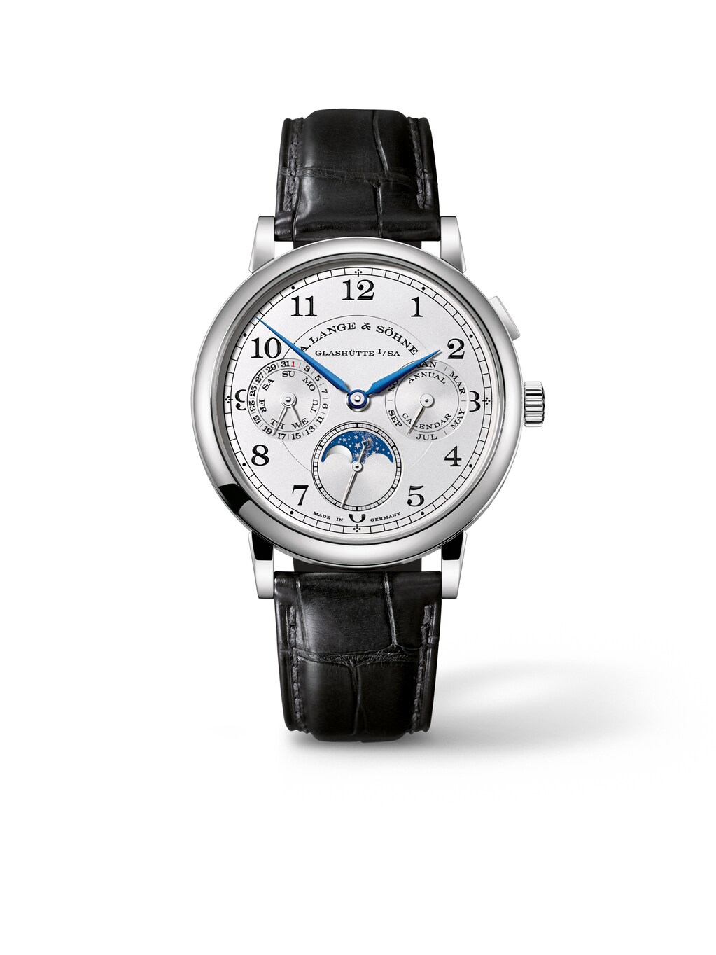 1815 Annual Calender 40 mm, oro blanco de 18k con pulsera de piel de aligátor de color negro, calibre de manufactura de cuerda manual L051.3 con calendario anual e indicación de fases lunares | N.° de referencia LA200033