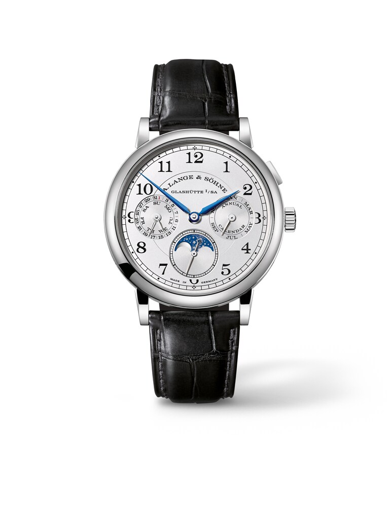 Lange entiende el 1815 Annual Calender como un homenaje al reloj de bolsillo. El calibre de manufactura L051.3 de cuerda manual muestra el día, día de la semana, mes y la fase lunar calculada con exactitud para 122,6 años. La luna y las estrellas de oro blanco destacan sobre un brillante cielo de color azul intenso. Las agujas azuladas muestran de manera centrada las horas y los minutos. La caja de oro blanco de 18k presenta unas dimensiones de 40 × 10,1 milímetros.