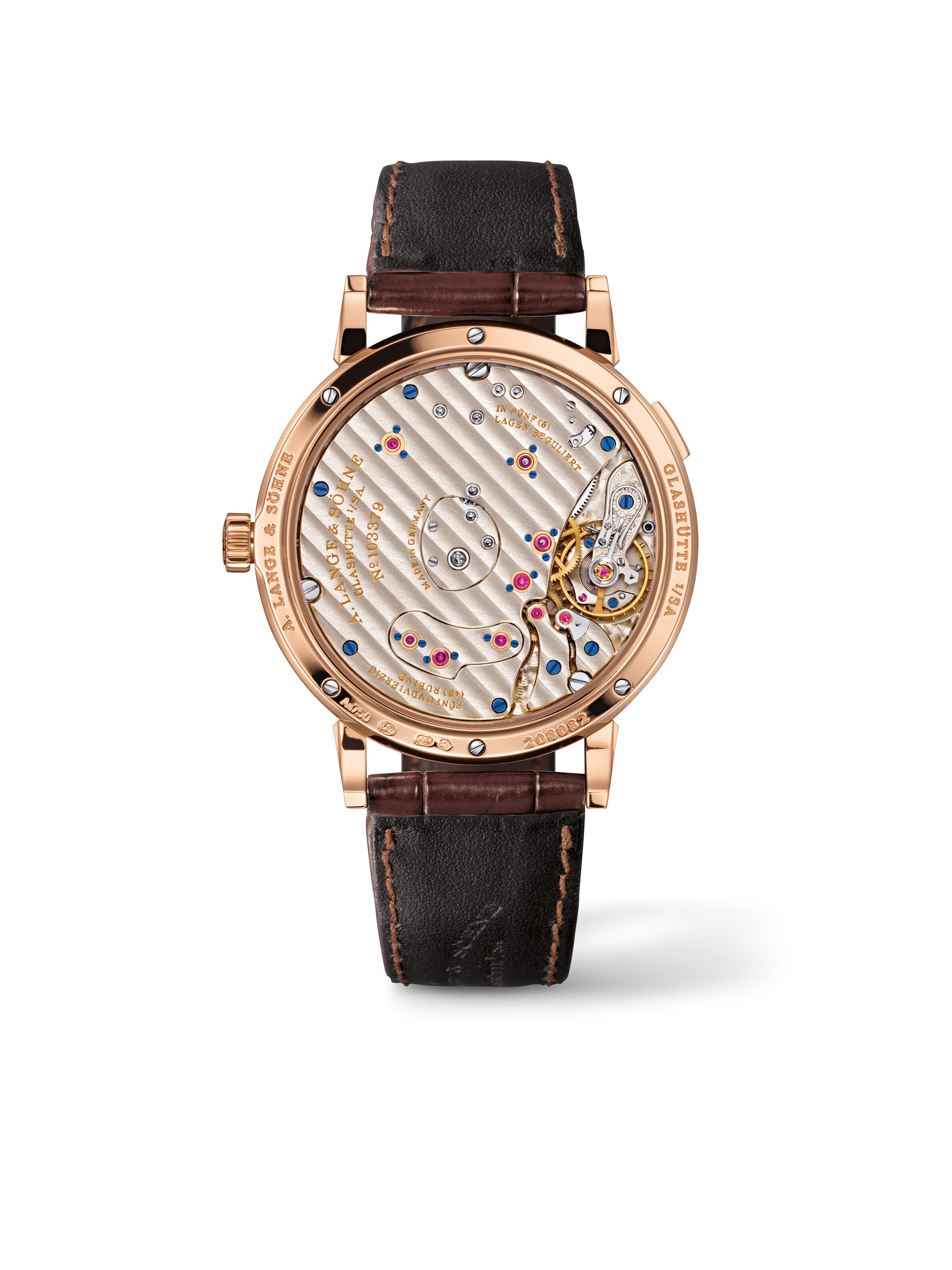 Grand Lange 1 Moon Phase 41 mm, oro rosa de 18k con pulsera de piel de aligátor de color castaño, calibre de manufactura de cuerda manual L095.3 con indicación de gran fecha y fases lunares | N.° de referencia LA410068