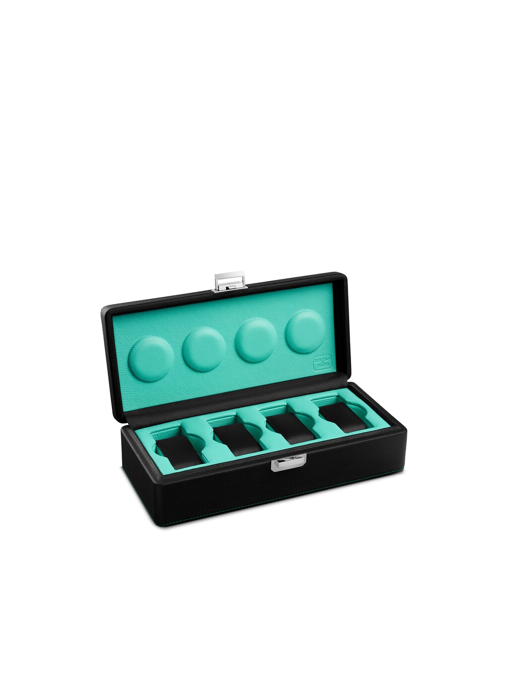 Ideal für Ihre wachsende Sammlung. Das luxuriöse Uhrenetui Valigetta 4 (Ref. VALIGETTA 4 BLACK/ BLUE TIFFANY) von Scatola del Tempo ist eine edle wie sinnvolle Aufbewahrungsmöglichkeit für bis zu vier Ihrer Lieblingsarmbanduhren. Die herausnehmbaren Uhrenfächer sind umgeben von stoßdämpfendem Material und garantieren einen staubfreien und sicheren Ort für Zeitmesser mit einem Durchmesser von bis zu 56 Millimetern einschließlich der Krone. Bei der Produktion setzt die Marke auf reine Qualität, bestes Handwerk und die Verwendung hochwertiger Materialien. So ist diese Uhrenbox in Italien handgefertigt und innen mit türkisem sowie außen mit schwarzem vollnarbigen Rindsleder verkleidet. Liebe zum Detail beweisen die farblich abgestimmten Ziernähte und die Aufbringung des Logos im Deckel. Mit einer übersichtlichen Größe von 30 x 9 x 14 Zentimetern begleitet Sie dieses stilvolle Uhrenaccessoire auch auf Reisen.