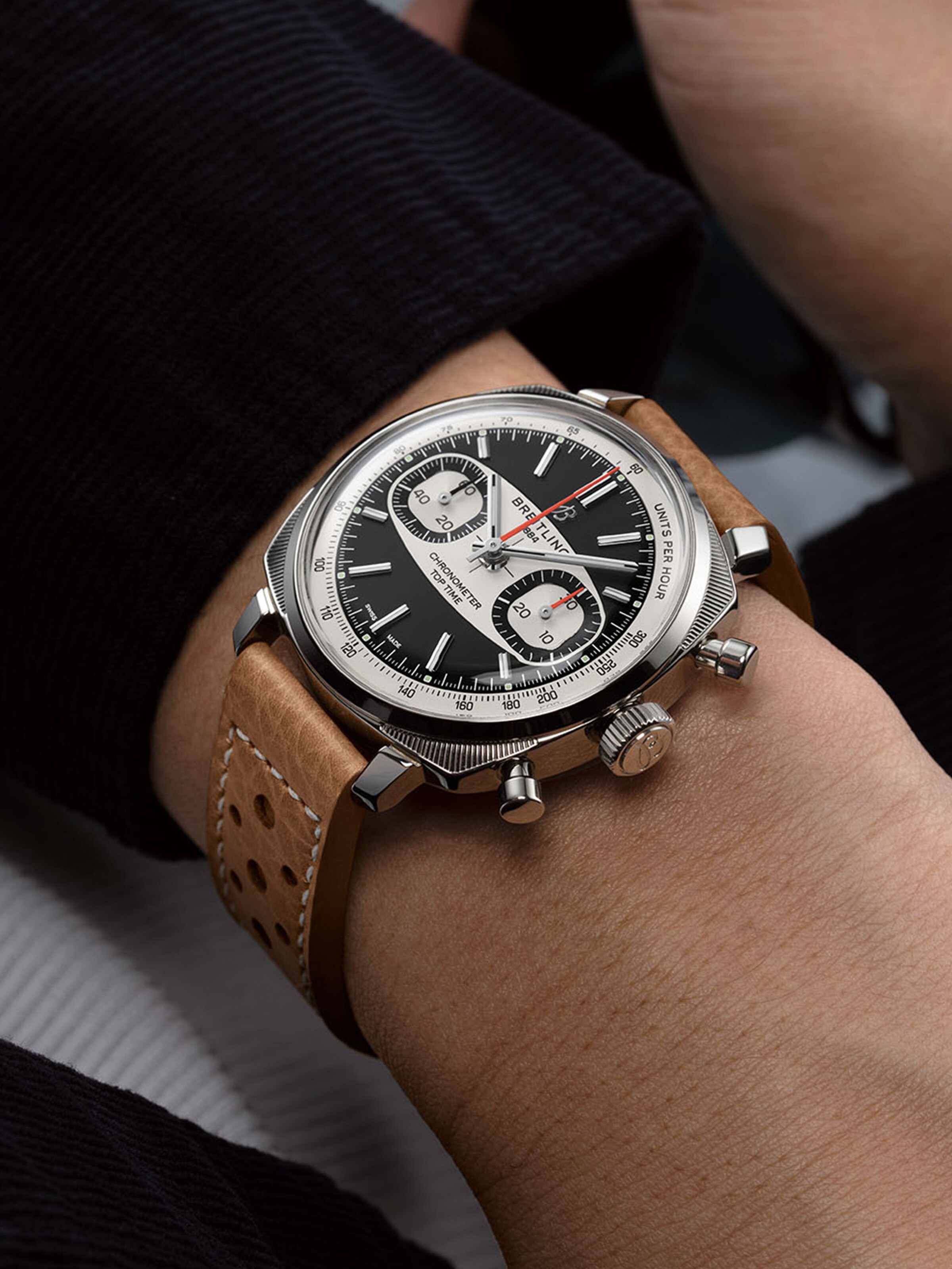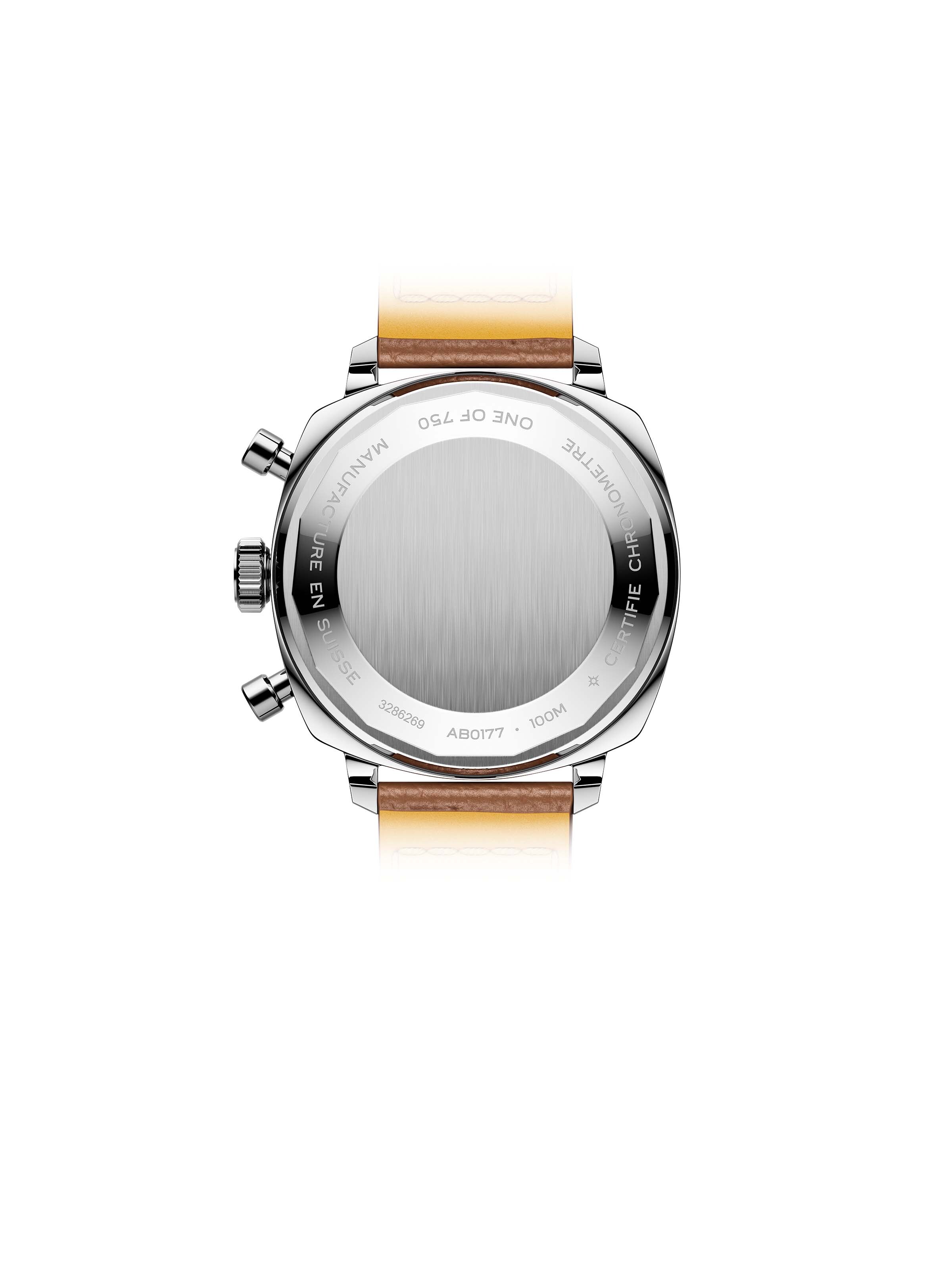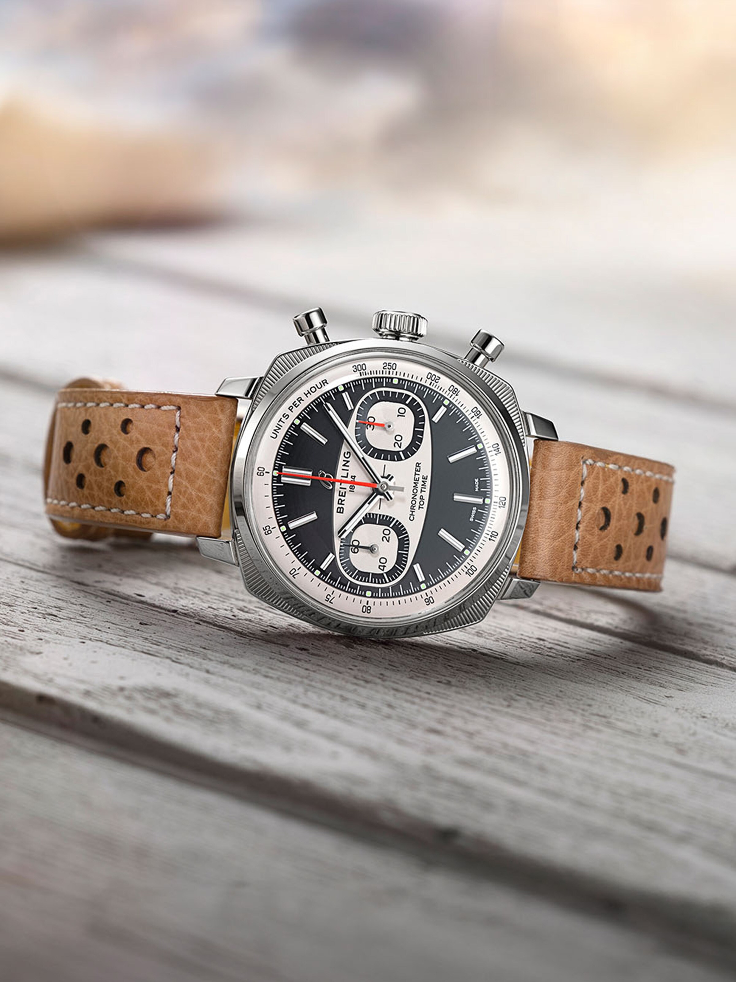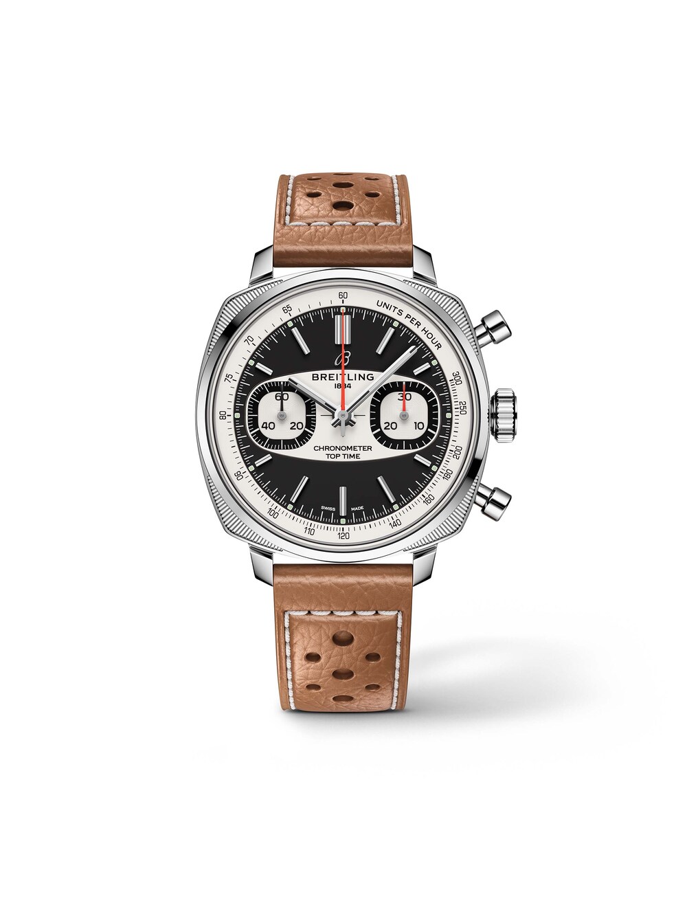 Top Time B01 Racing 38 mm, acero inoxidable con correa de piel de becerro marrón, calibre automático de fabricación Breitling B01 con función de cronógrafo | N.° de referencia BL600084