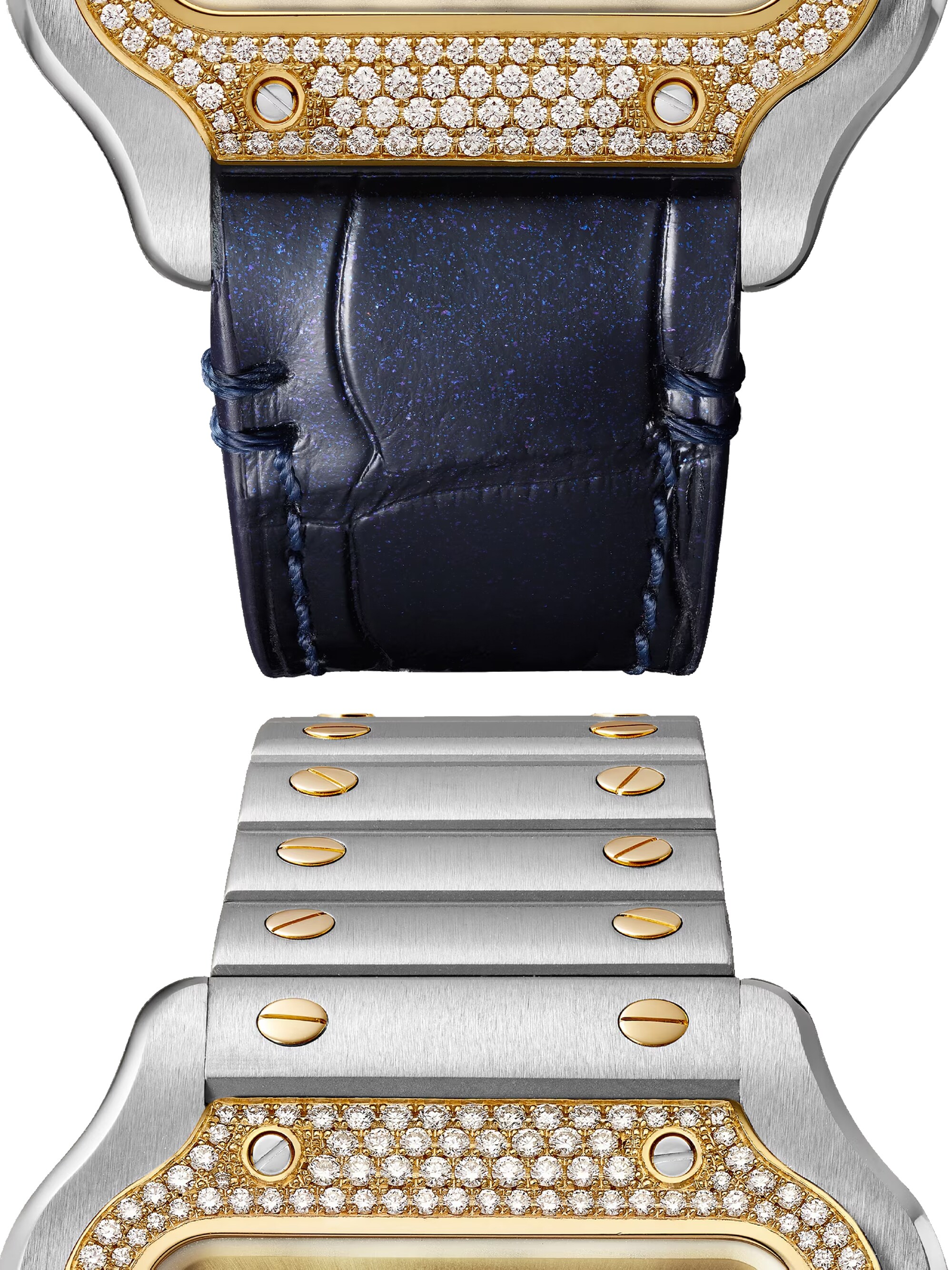 Reloj Santos, tamaño mediano, movimiento mecánico de carga automática calibre 1847 MC. Caja de acero. Bisel de oro amarillo 750/1000 engastado con 206 diamantes talla brillante con un total de 0,64 quilates. Corona heptagonal decorada con una espinela sintética facetada. Esfera dorada efecto rayos de sol. Agujas de acero azulado en forma de espada. Cristal de zafiro. Brazalete de acero con sistema de modificación de la talla SmartLink. Correa adicional de piel de aligátor. Hebilla desplegable intercambiable de acero. Las dos correas están equipadas con el sistema intercambiable QuickSwitch. Ancho de la caja: 35,1 mm. Grosor: 8,83 mm. Hermético hasta 10 bares (~100 metros).