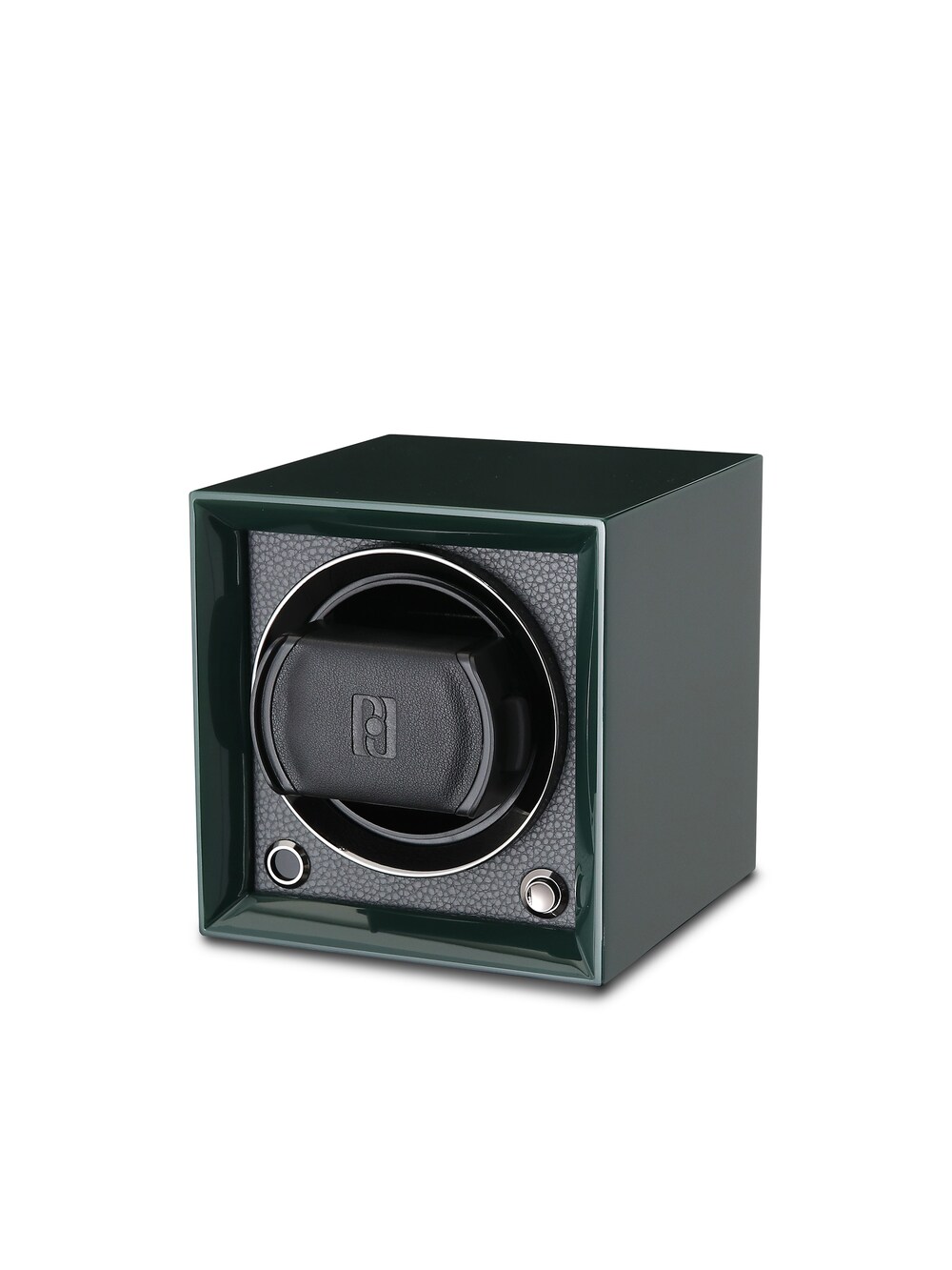 Con el enrollador de reloj artesanal Gentlemen 1 (Ref. 20082 Gentlemen 1 Green Wempe Exclusive), podrá aprender fácilmente a mantener un reloj automático en funcionamiento para siempre. En la caja de madera de 12 x 12,5 x 12,5 centímetros con acabado verde multicapa de alto brillo, su reloj automático gira en el sentido de las agujas del reloj, en sentido contrario o alternativamente, de modo que no es necesario darle cuerda y volver a ponerlo a cero cuando se toma un descanso de llevarlo. Los movimientos del rotor pueden ajustarse en un abrir y cerrar de ojos gracias a su sencillo manejo mediante pulsadores. El funcionamiento a pilas opcional garantiza una presentación elegante en el lugar que elija.