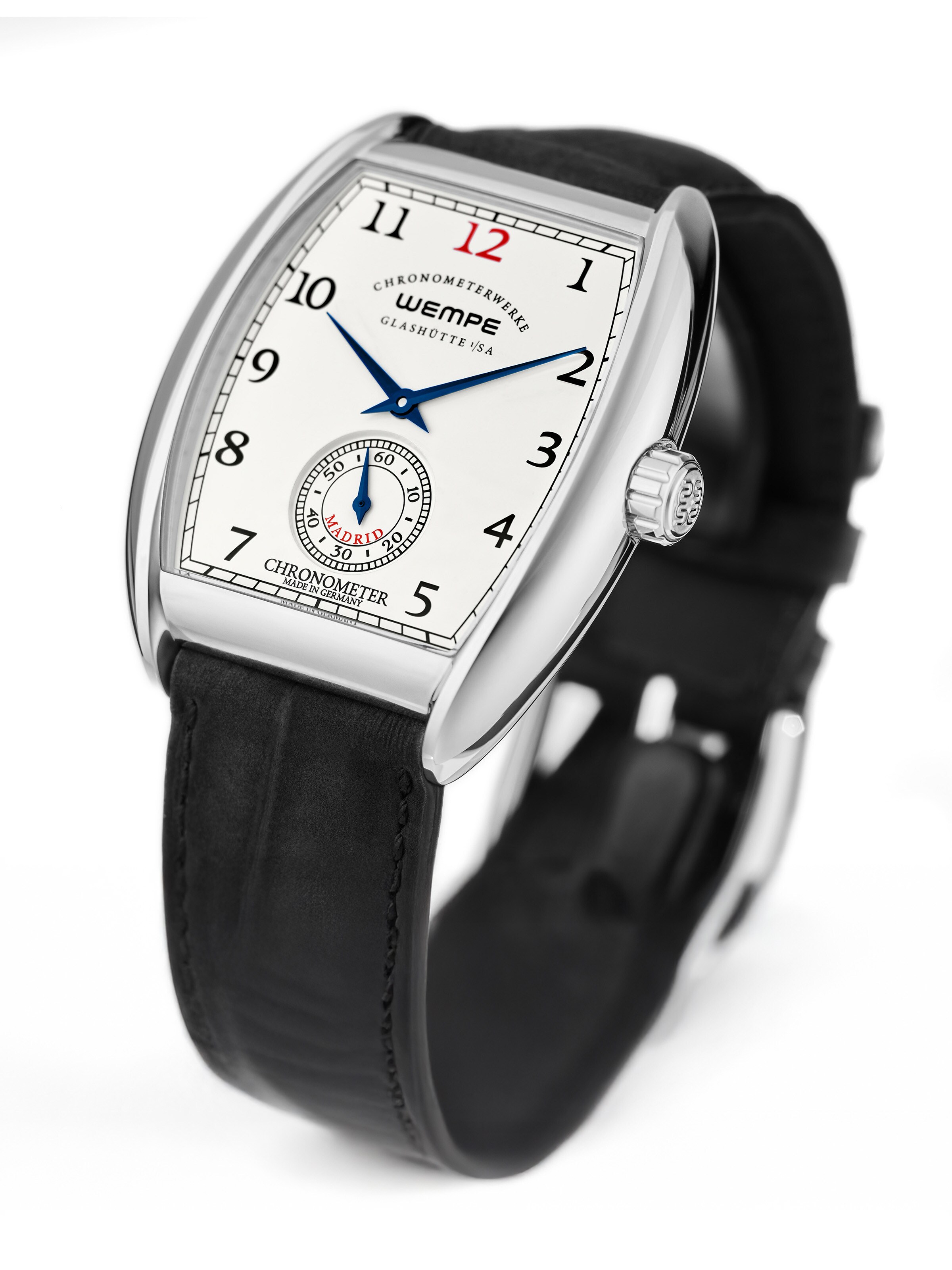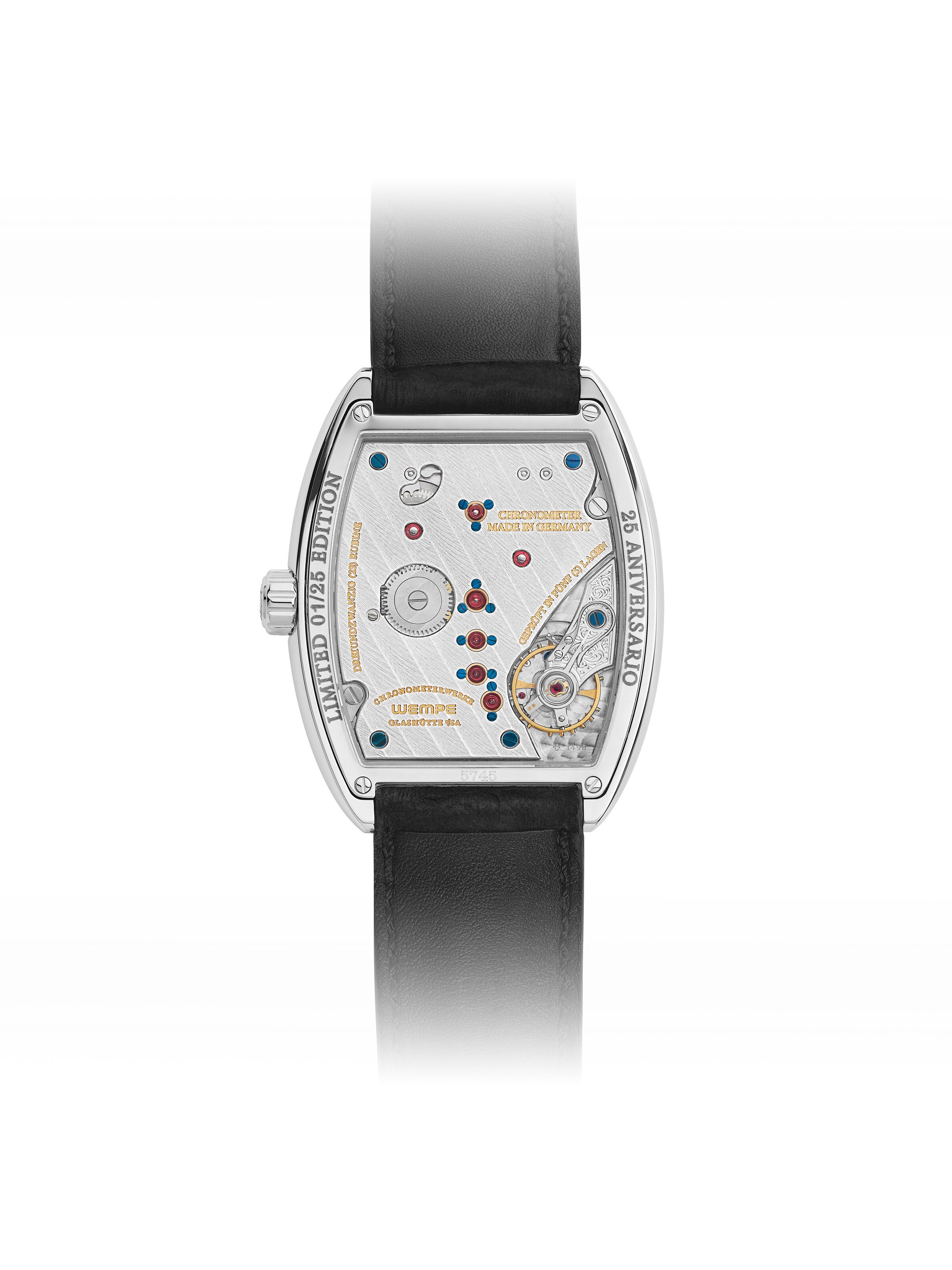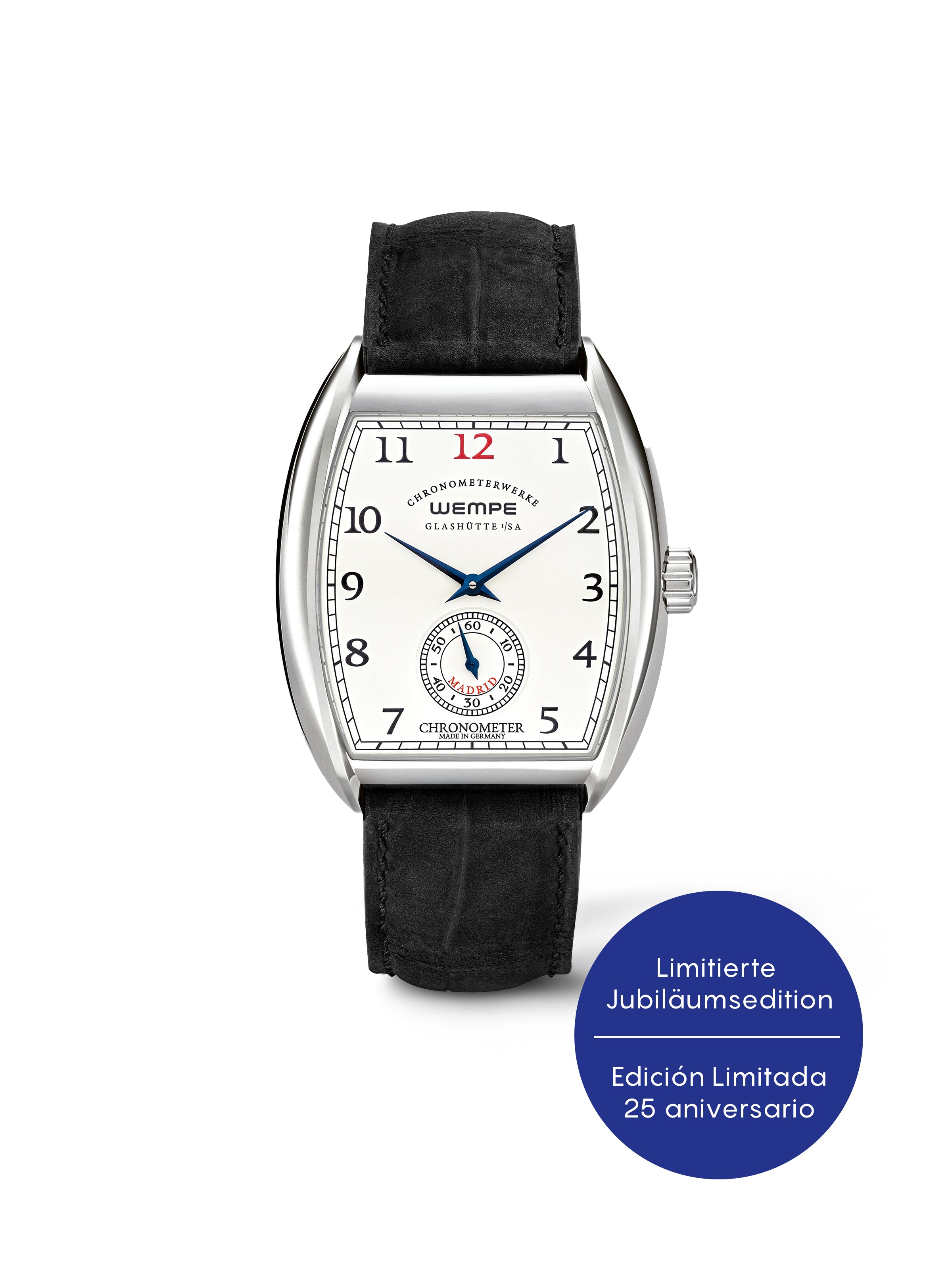 El Chronometerwerke Tonneau de Wempe Glashütte i/SA, referencia WG690001, encarna una extraordinaria combinación de tradición y modernidad que adorna las muñecas de hombres y mujeres por igual. Como edición especial para conmemorar el 25 aniversario de la sucursal madrileña, esta obra maestra está limitada a sólo 25 piezas, lo que la convierte en un raro tesoro. La esfera blanca, protegida por un robusto cristal de zafiro, armoniza a la perfección con la correa de aligátor negra y es toda una declaración de elegancia. El fondo de cristal de zafiro permite ver el corazón del reloj, el calibre CW 1 de cuerda manual, que ofrece una impresionante reserva de marcha de 80 horas. Certificado por la prueba de cronómetro TLV & SME de Glashütte, este reloj promete precisión y fiabilidad. Los índices arábigos y el segundero pequeño añaden un toque clásico al conjunto, mientras que la resistencia al agua de 3 bar resiste los retos cotidianos. Con una caja y un bisel de acero inoxidable, así como una hebilla de pasador, el reloj combina la máxima calidad con un diseño atemporal.