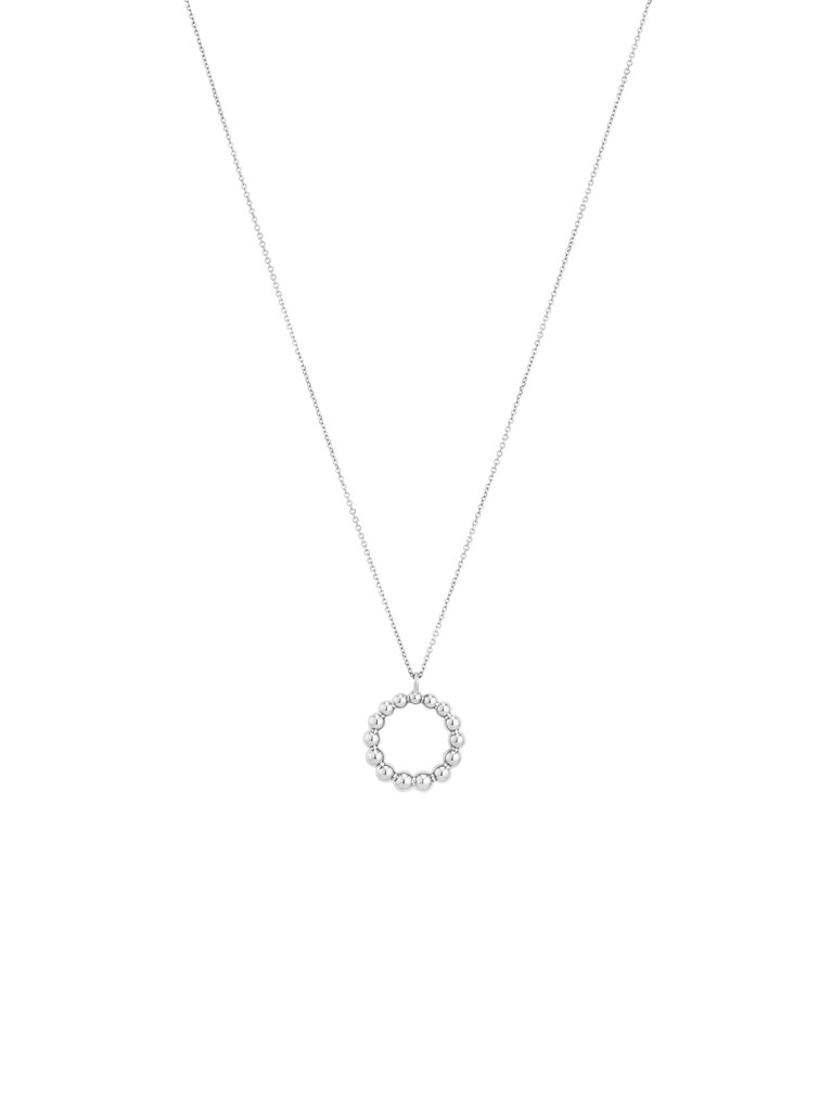 Une référence ludique à notre globe terrestre : Dans la chaîne à pendentif Blu BY KIM, des billes entièrement fabriquées à la main forment un anneau scintillant. Attachés à une chaîne en or gris 18ct, les éléments Blu se distinguent par leur forme particulière : pas complètement ronds, mais légèrement aplatis aux pôles. Cette chaîne à pendentif avec oeillet intermédiaire à 40 centimètres peut être combinée de nombreuses façons, aussi bien avec un jean décontracté qu'avec une robe chic.