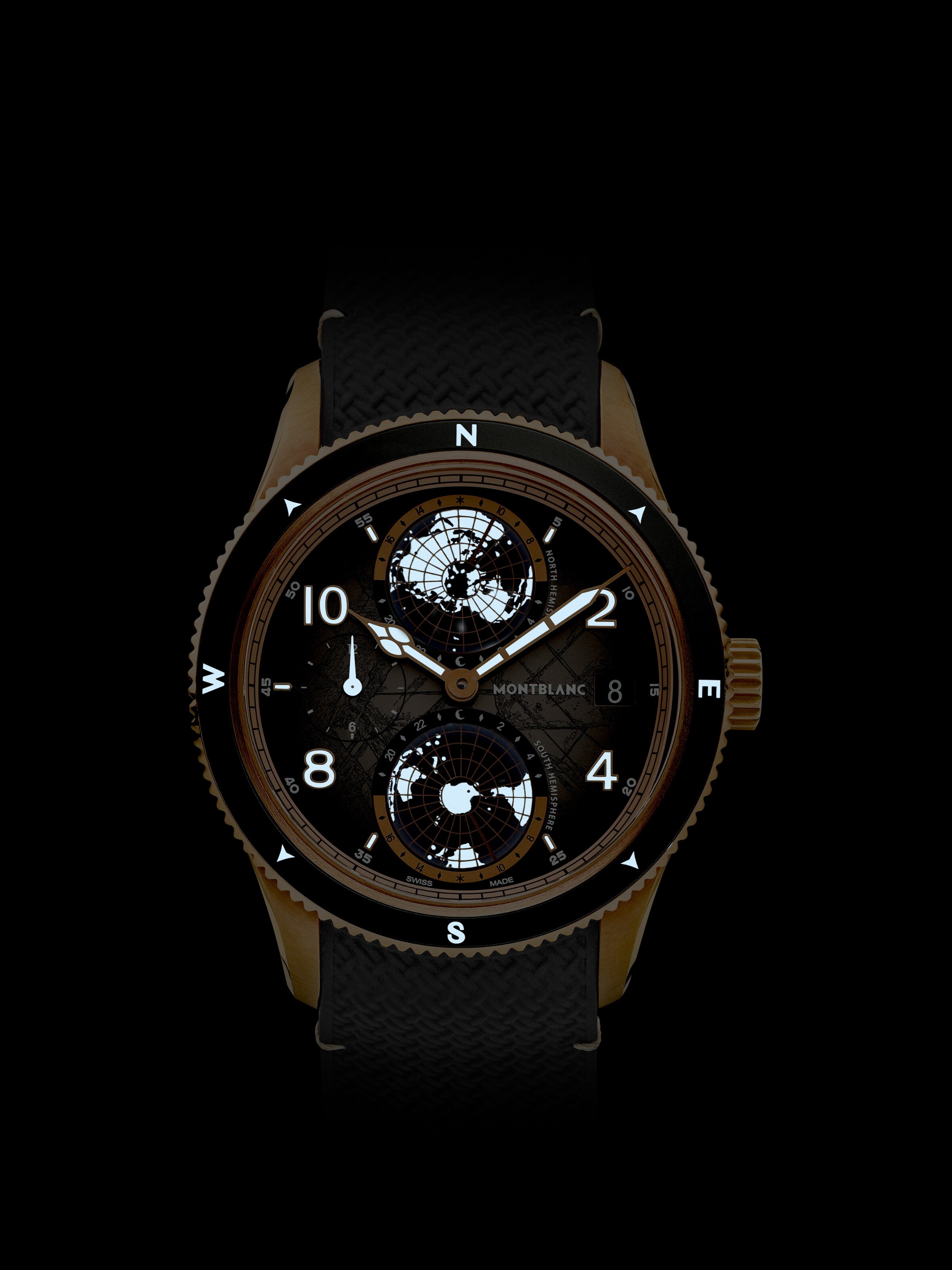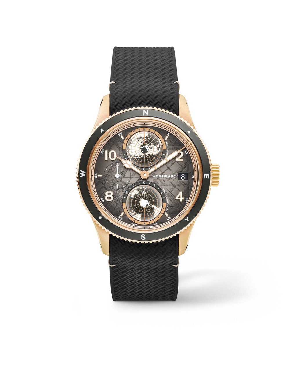 Montblanc 1858 Geosphere 0 Oxygen Monte Rosa 42 mm, or rose 18ct avec bracelet en caoutchouc noir, calibre de manufacture automatique MB29.25 avec complication heure universelle, échelle de 24 heures, affichage jour/nuit, second fuseau horaire et affichage de la date | Numéro de référence MB000078