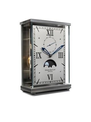 Un objet d'ameublement classique qui connaît une renaissance. L'horloge de table Erwin Sattler Lunaris II Clair séduit par son boîtier rectangulaire à l'aspect élégant et son verre minéral antireflet. Le cadran argenté est doté d'aiguilles sobres et de chiffres romains, qui sont très lisibles même à distance. À l'intérieur, le calibre Sattler 2004 fait tic-tac.