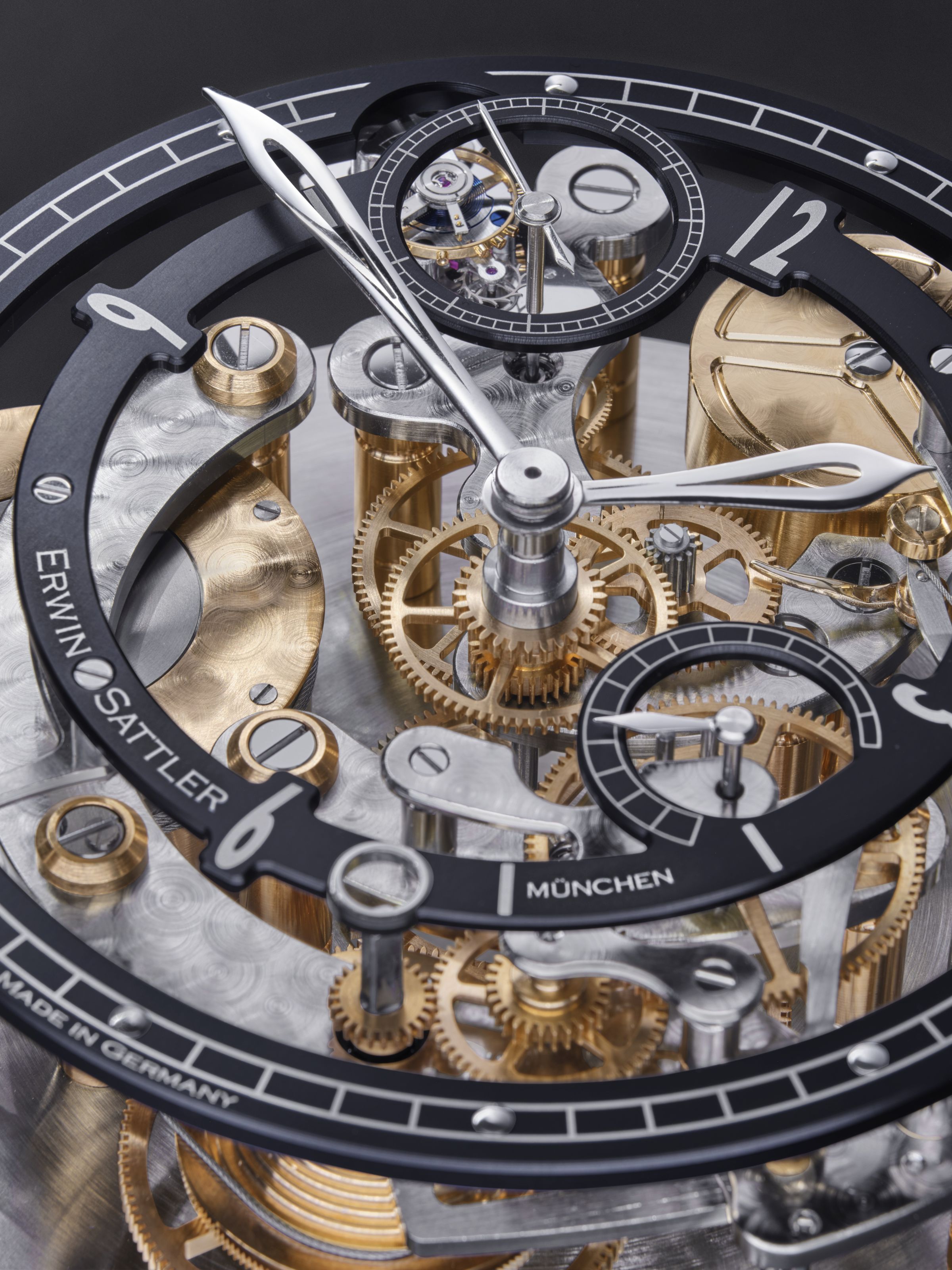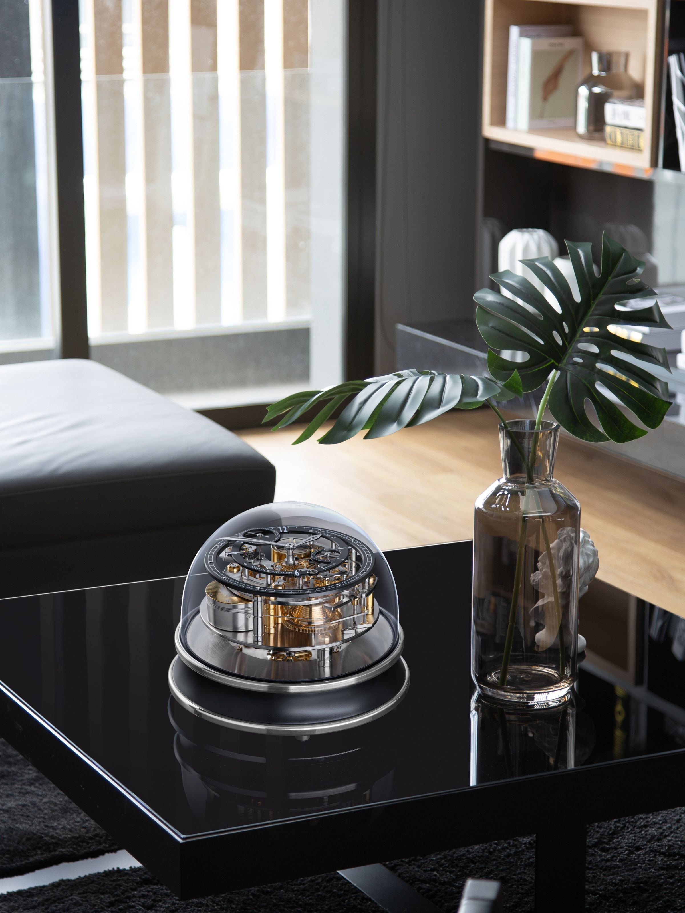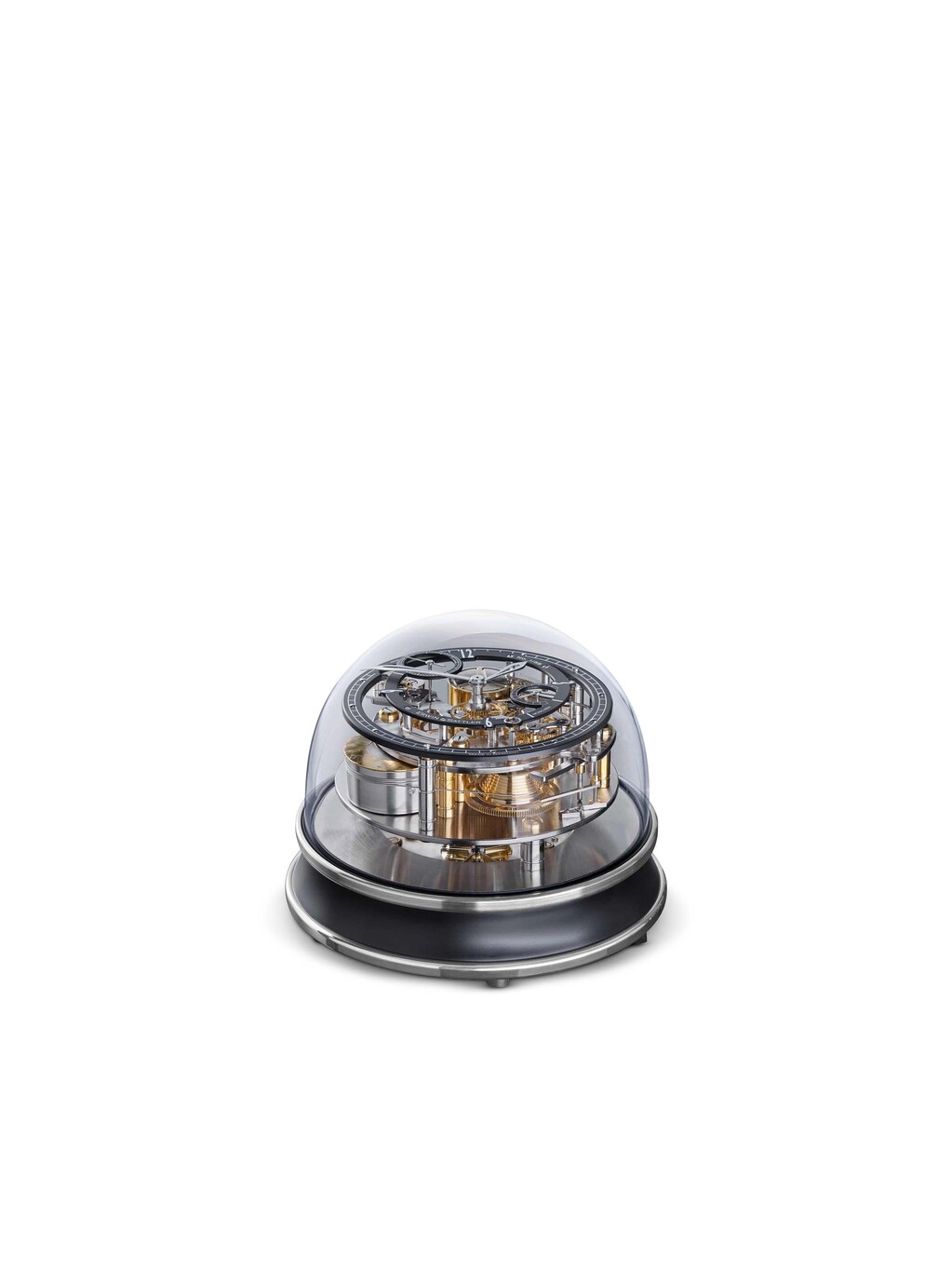 La pendule de bureau Vitrea d'Erwin Sattler allie l'art horloger classique à l'élégance moderne. Son boîte, une coupole en verre soufflé à la bouche, laisse apparaître le mouvement précis Sattler calibre 1381 avec une réserve de marche de 15 jours, fabriqué de manière traditionnelle à la main. Le boîte de 24 centimètres de haut offre une vue à 360° sur le mécanisme de l'horloge, qui semble flotter dans les airs. Les pièces en acier poli et doré ainsi que les gravures précises reflètent l'amour du détail. Un coup de passage sous la forme d'un son de cloche raffiné annonce discrètement l'heure. Limitée à 58 exemplaires, la Vitrea allie sophistication technique et élégance, embellissant avec discrétion tout intérieur. Dimensions : 24 cm x 29,5 cm x 29,5 cm (H x L x P)