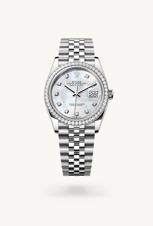 Ce cadran est doté de diamants sertis dans des chatons en or 18 ct. La nacre est par nature pleine de mystères et de surprises. En fonction de son origine, elle peut être rose, blanche, noire ou jaune. L’intensité de sa couleur et sa structure varient en fonction de la partie du coquillage dont elle est issue. Chez Rolex, la nacre n’est jamais artificiellement colorée. Au contraire, tout le savoir‑faire et l’expérience de la marque sont mis en œuvre pour souligner sa beauté naturelle et préserver ses teintes d’origine. Les cadrans en nacre étant uniques, jamais un cadran identique à celui de votre montre ne viendra décorer un autre poignet.